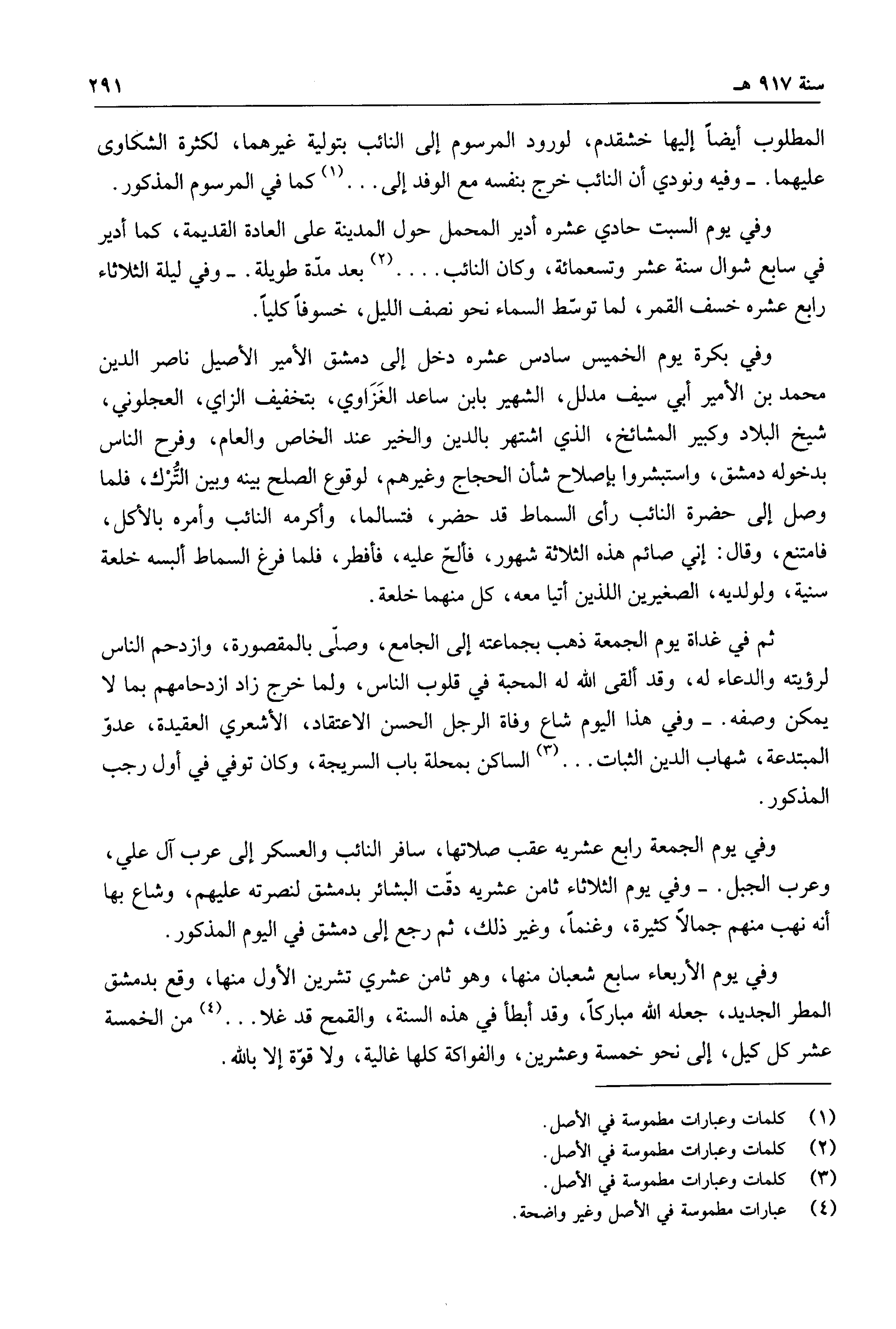وفي يوم السبت حادي عشره أدير المحمل حول المدينة على العادة القديمة، كما أدير في سابع شوال سنة عشر وتسعمائة، وكان النائب ... بعد مدة طويلة. وفي ليلة الثلاثاء رابع عشره خسف القمر، لما توسط السماء نحو نصف الليل، خسوفاً كلياً.