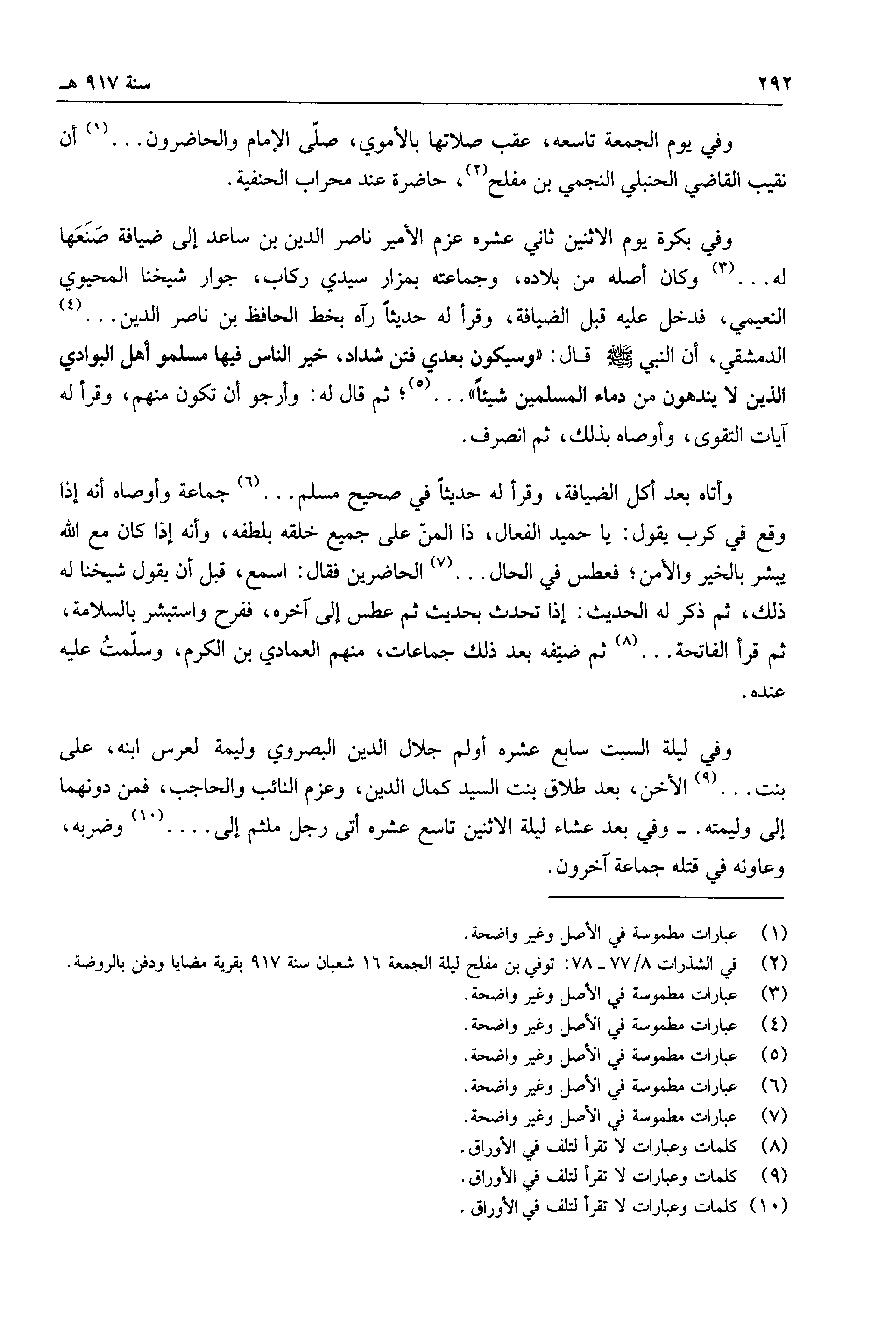 وفي ليلة السبت سابع عشره أولم جلال الدين بن البصروي وليمة لعرس ابنه، على بنت ... الأخن، بعد طلاق بنت السيد كمال الدين، وعزم النائب والحاجب، فمن دونهما إلى وليمته. وفي بعد عشاء ليلة الاثنين تاسع عشره أتى رجل ملثم إلى ... وضربه، وعاونه في قتله جماعة آخرون.