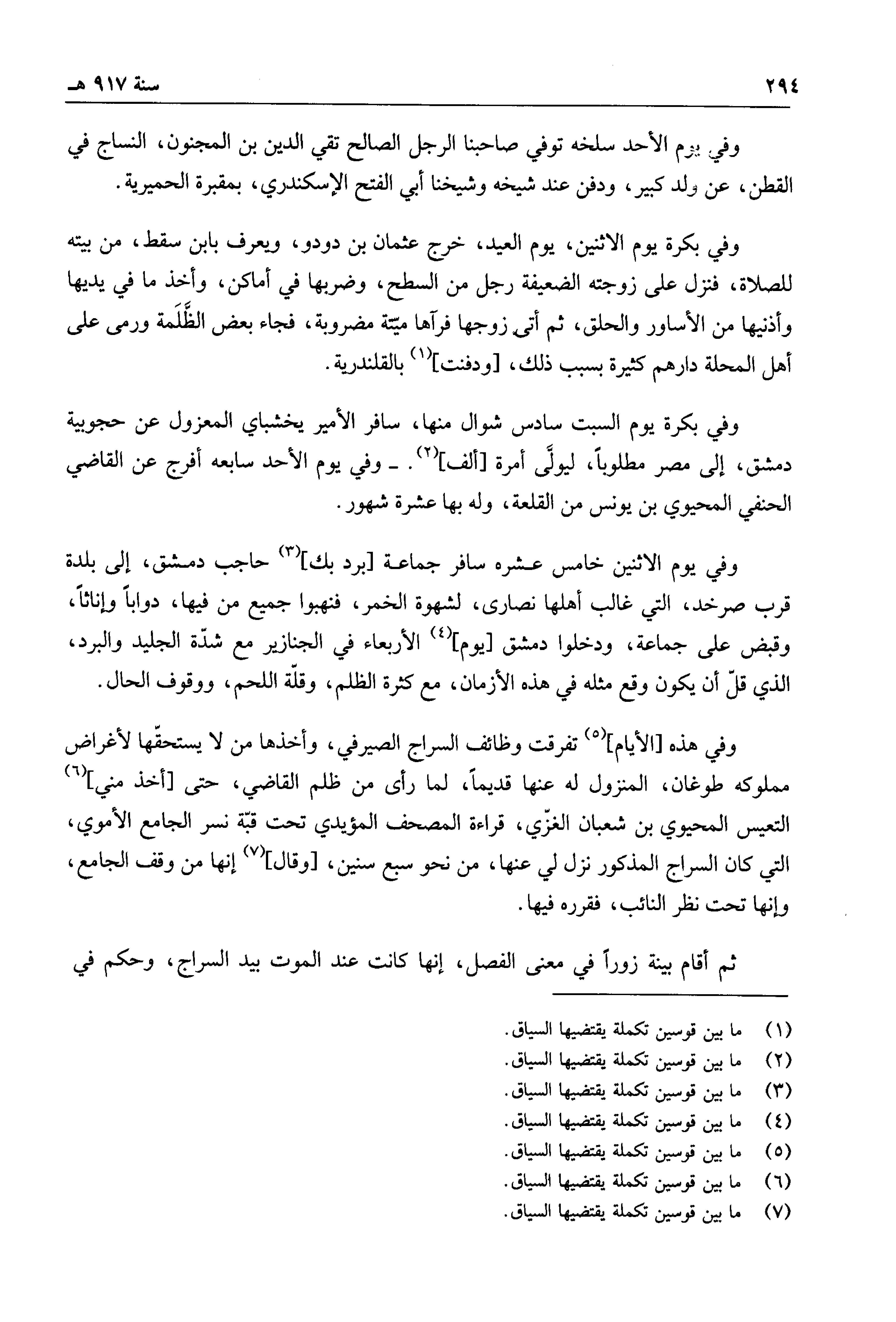 وفي هذه الأيام تفرقت وظائف السراج الصيرفي، وأخذها من لا يستحقها لأغراض مملوكه طوغان، المنزول له عنها قديماً، لما رأى من ظلم القاضي، حتى أخذ مني التعيس المحيوي بن شعبان الغزي، قراءة المصحف المؤيدي تحت قبة نسر الجامع الأموي، التي كان السراج المذكور نزل لي عنها، من نحو سبع سنين، وقال إنها من وقف الجامع، وإنها تحت نظر النائب، فقرره فيها.