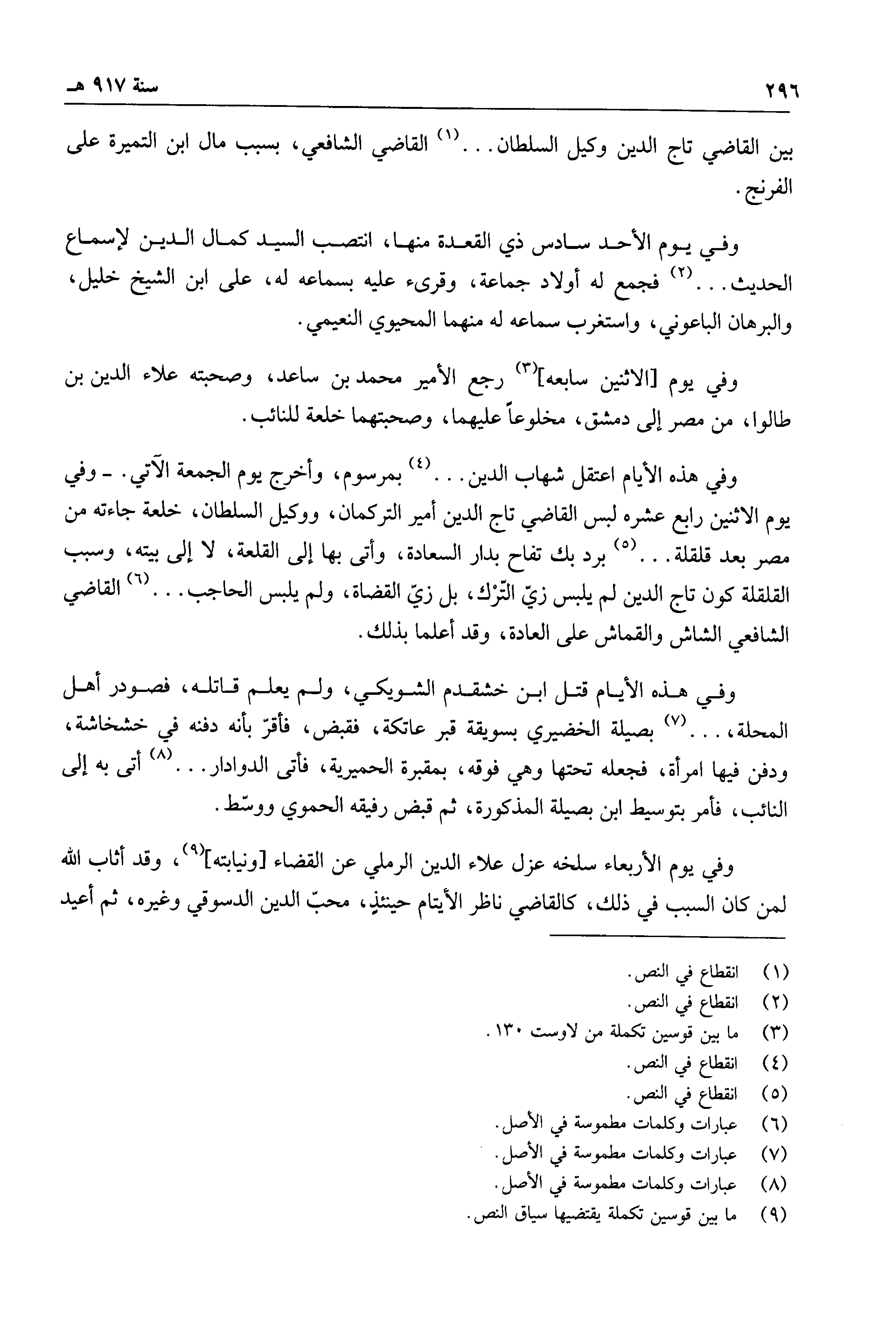 وفي يوم الاثنين رابع عشره لبس القاضي تاج الدين أمير التركمان، ووكيل السلطان، خلع جاءته من مصر بعد قلقلة ... برد بك تفاح بدار السعادة، وأتى بها إلى القلعة، لا إلى بيته، وسبب القلقلة كون تاج الدين لم يلبس زي الترك، بل زي القضاة، ولم يلبس الحاجب ... القاضي الشافعي الشاش والقماش على العادة، وقد أعلما بذلك.