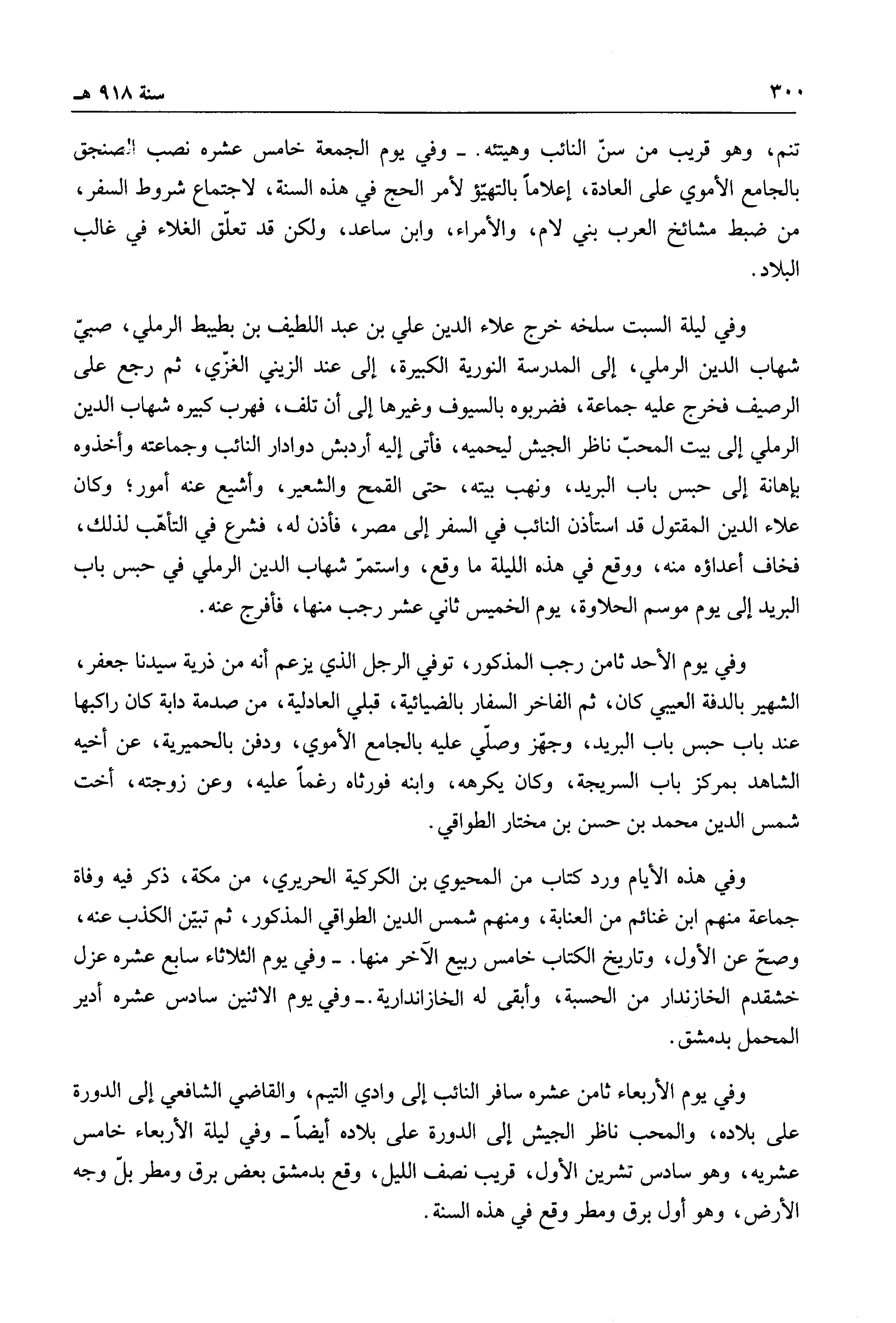 تنم، وهو قريب من سن النائب وهيتئه. وفي يوم الجمعة خامس عشره نصب الصنجق بالجامع الأموي على العادة، إعلاماً بالتهيؤ لأمر الحج في هذه السنة، لا جتماع شروط السفر، من ضبط مشائخ العرب بني لام، والأمراء، وابن ساعد، ولكن قد تعلق الغلاء في غالب البلاد.