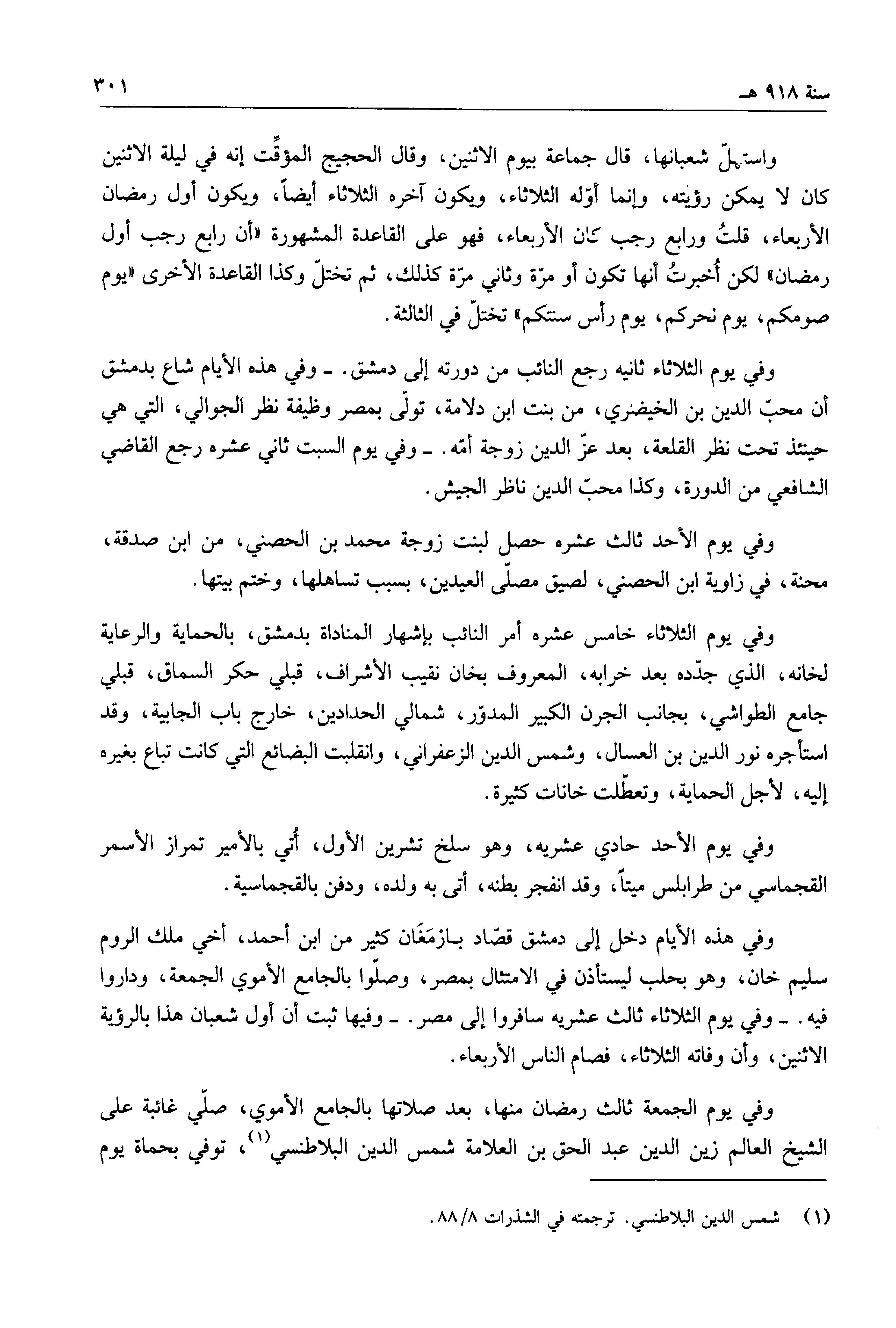 وفي هذه الأيام دخل إلى دمشق قصاد بارمغان كثير من ابن أحمد، أخي ملك الروم سليم خان، وهو بحلب ليستأذن في الامتثال بمصر، وصلوا بالجامع الأموي الجمعة، وداروا فيه، وفي يوم الثلاثاء ثالث عشريه سافروا إلى مصر. وفيها ثبت أن أول شعبان هذا بالرؤية الاثنين، وأن وفاته الثلاثاء، فصام الناس الأربعاء.