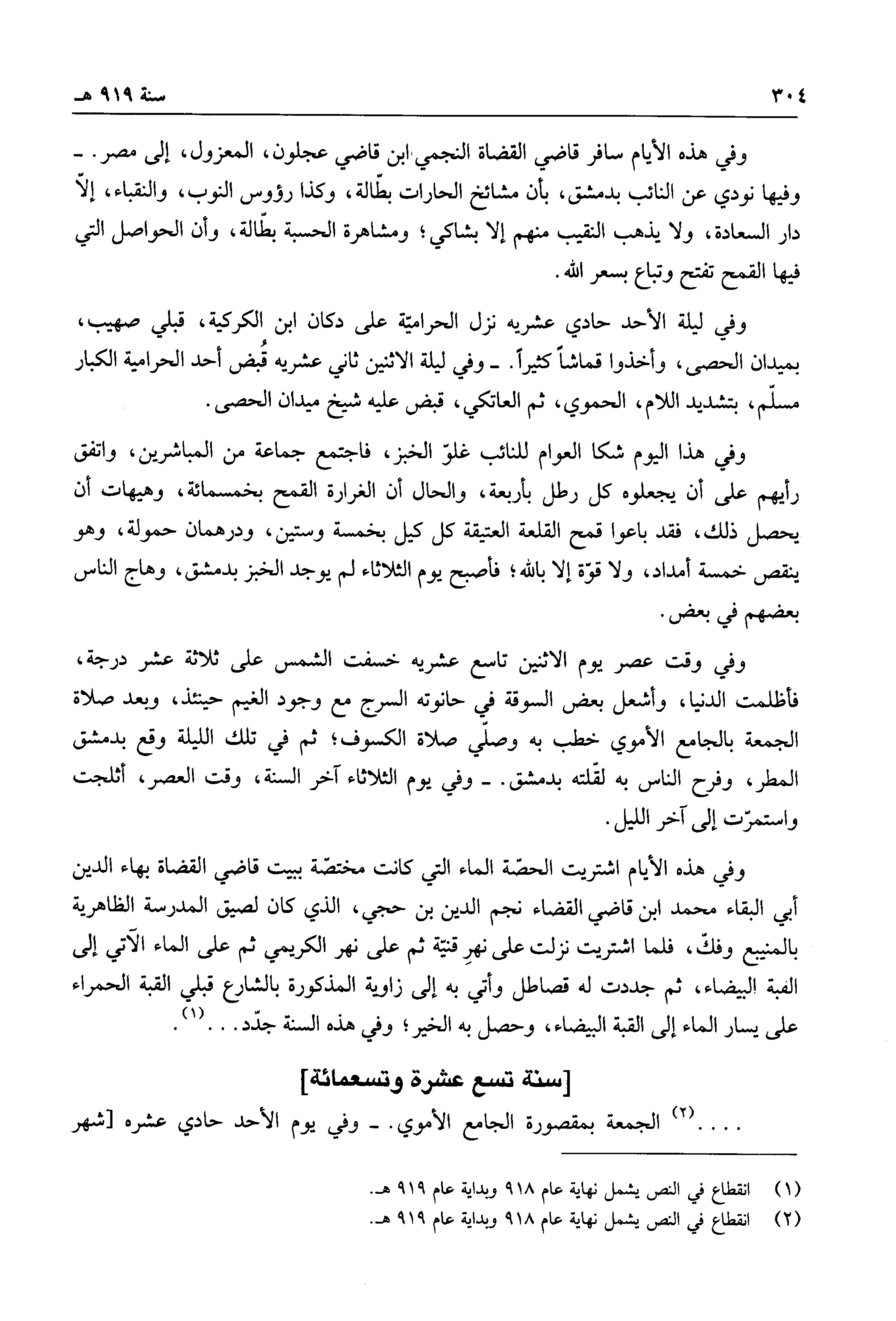 وفي هذه الأيام سافر قاضي القضاة النجمي ابن قاضي عجلون، المعزول، إلى مصر. وفيها نودي عن النائب بدمشق، بأن مشائخ الحارت بطالة، وكذا رؤوس النوب، والنقباء، إلا دار السعادة، ولا يذهب النقيب منهم إلا بشاكي؛ ومشاهرة الحسبة بطالة، وأن الحواصل التي فيها القمح تفتح وتباع بسعر الله.