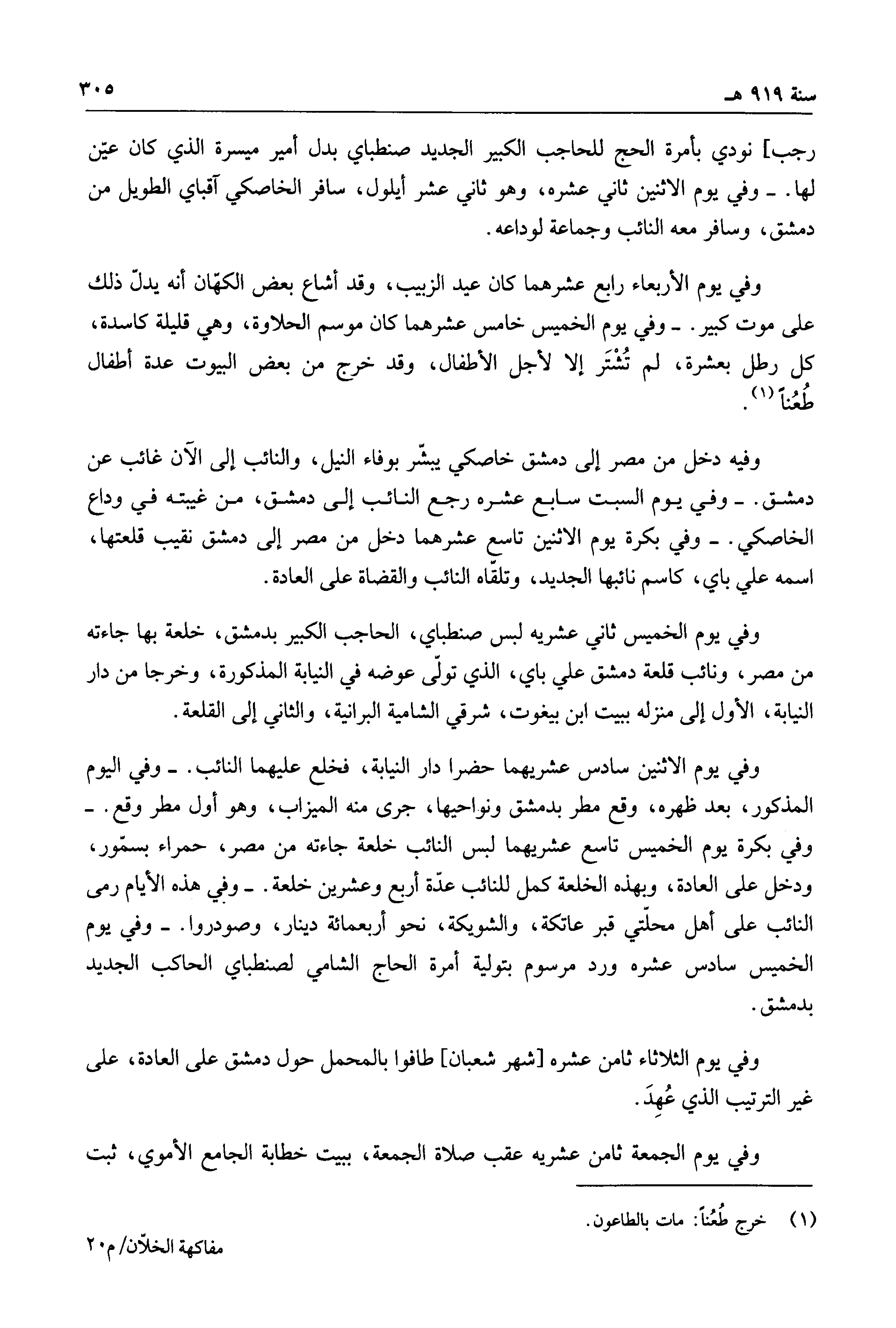وفي يوم الاثنين سادس عشريهما حضرا دار النيابة، فخلع عليهما النائب. وفي اليوم المذكور، بعد ظهره، وقع مطر بدمشق ونواحيها، جرى منه الميزاب، وهو أول مطر وقع. وفي بكرة يوم الخميس تاسع عشريهما لبس النائب خلعة جاءته من مصر، حمراء بسمور، ودخل على العادة، وبهذه الخلعة كمل للنائب عدة أربع وعشرين خلعة. وفي هذه الأيام رمى النائب على أهل محلتي قبر عاتكة، والشويكة، نحو أربعمائة دينار، وصودروا. وفي يوم الخميس سادس عشره ورد مرسوم بتولية أمرة الحاج الشامي لصنطباي الحاكم الجديد بدمشق.