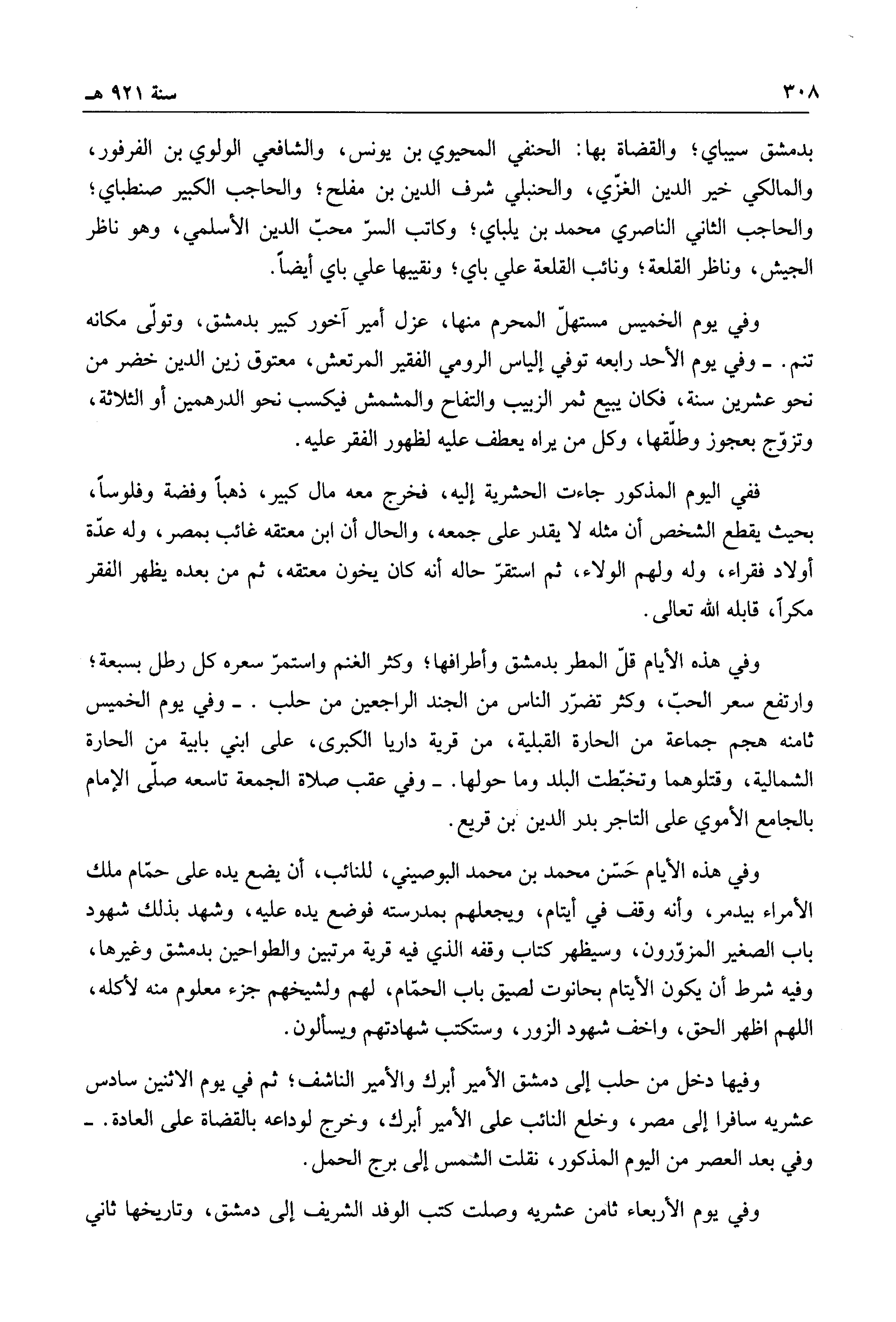 وفي هذه الأيام قل المطر بدمشق وأطرافها؛ وكثر الغنم واستمر سعره كل رطل بسبعة؛ وارتفع سعر الحب، وكثر تضرر الناس من الجند الراجعين من حلب. وفي يوم الخميس ثامنه هجم جماعة من الحارة القبلية، من قرية داريا الكبرى، على ابني بابية من الحارة الشمالية، وقتلوهما وتخبطت البلد وما حولها. وفي عقب صلاة الجمعة تاسعه صلى الإمام بالجامع الأموي على التاجر بدر الدين بن قريع.