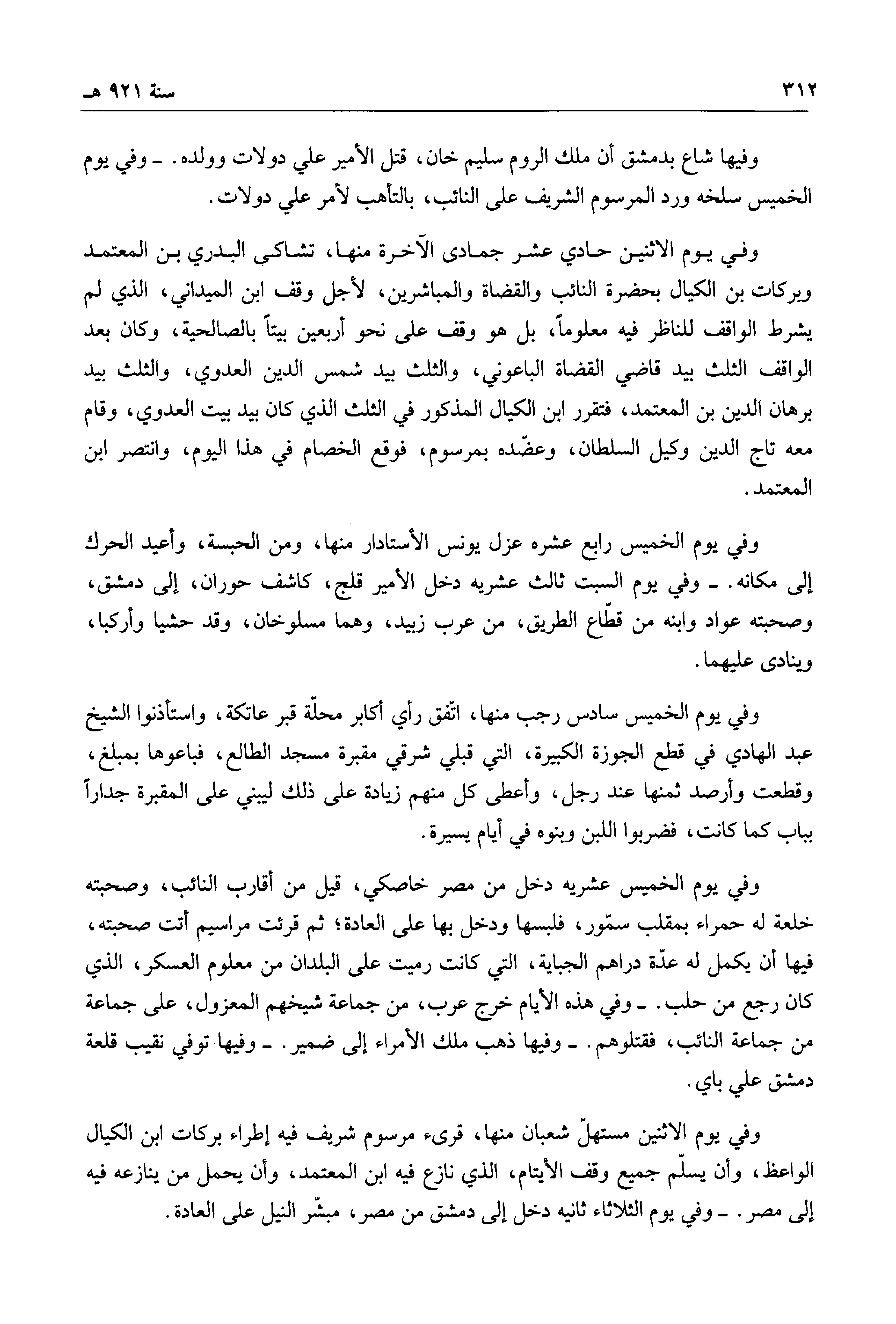 وفي يوم الاثنين مستهلّ شعبان منها، قريء مرسوم شريف فيه إطراء بركات ابن الكيال الواعظ، وأن يسلّم جميع وقف الأيتام، الذي نازع فيه ابن المعتمد، وأن يحمل من ينازعه فيه إلى مصر. - وفي يوم الثلاثاء ثانيه دخل إلى دمشق من مصر، مبشّر النيل على العادة.