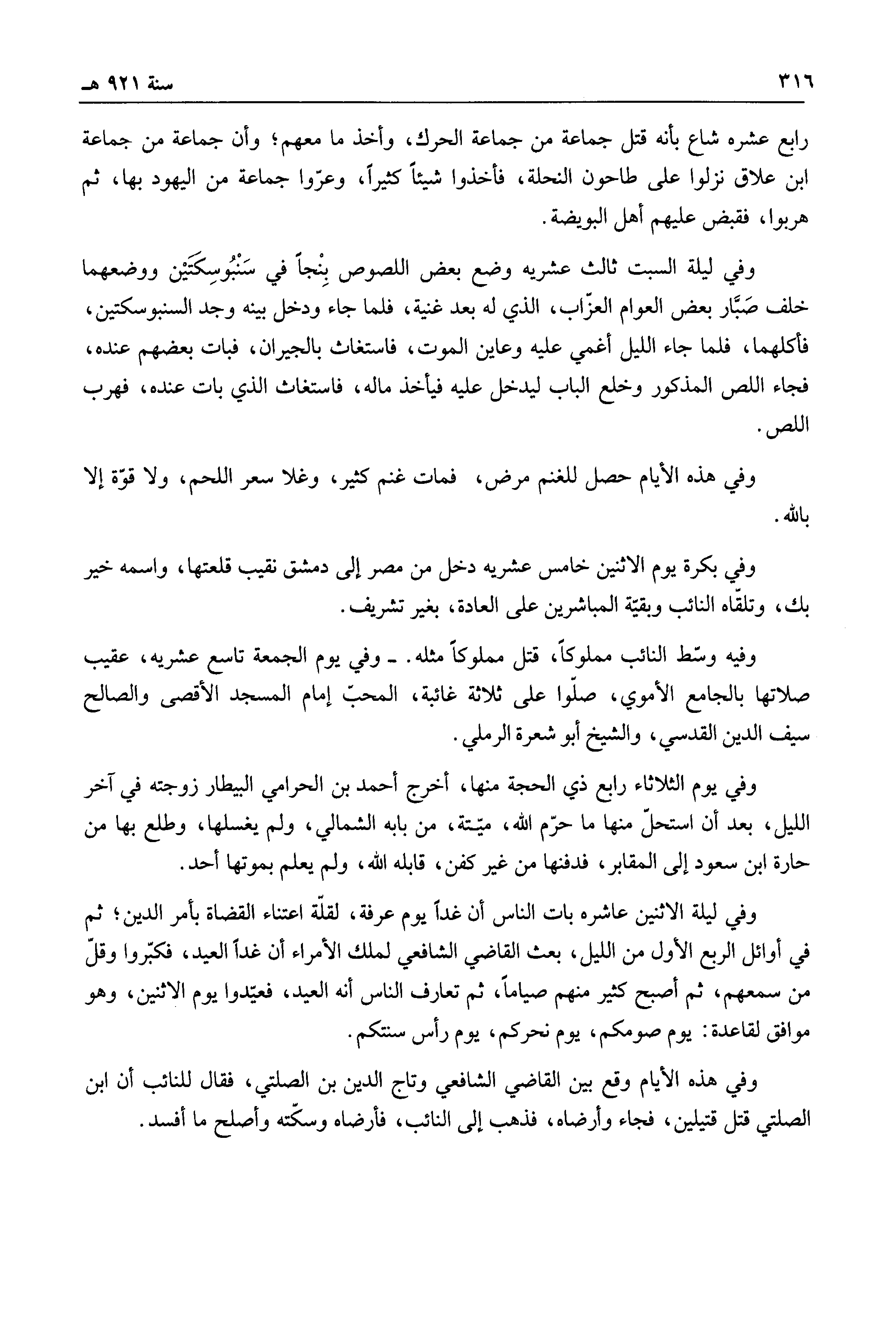 وفي ليلة الاثنين عاشره بات الناس أن غداً يوم عرفة، لقلة اعتناء القضاة بأمر الدين؛ ثم في أوائل الربع الأول من الليل، بعث القاضي الشافعي لملك الأمراء أن غداً العيد، فكبروا وقل من سمعهم، ثم أصبح كثير منهم صياماً، ثم تعارف الناس أنه العيد، فعيدوا يوم الاثنين، وهو موافق لقاعدة: يوم صومكم، يوم نحركم، يوم رأس سنتكم.