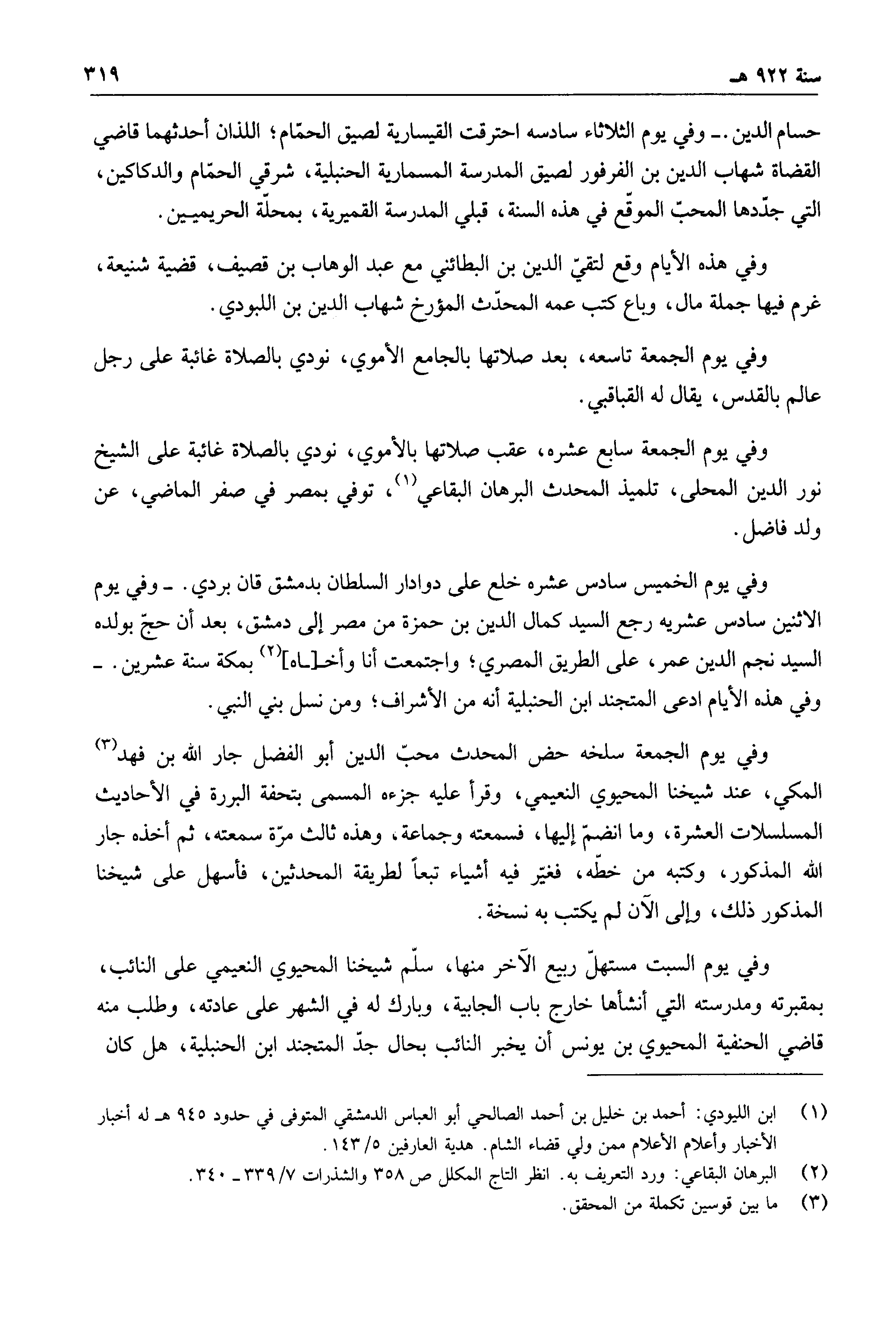 وفي يوم الجمعة سابع عشره، عقب صلاتها بالأموي، نودي بالصلاة غائبة على الشيخ نور الدين المحلى، تلميذ المحدث البرهان البقاعي، توفي بمصر في صفر الماضي، عن ولد فاضل.