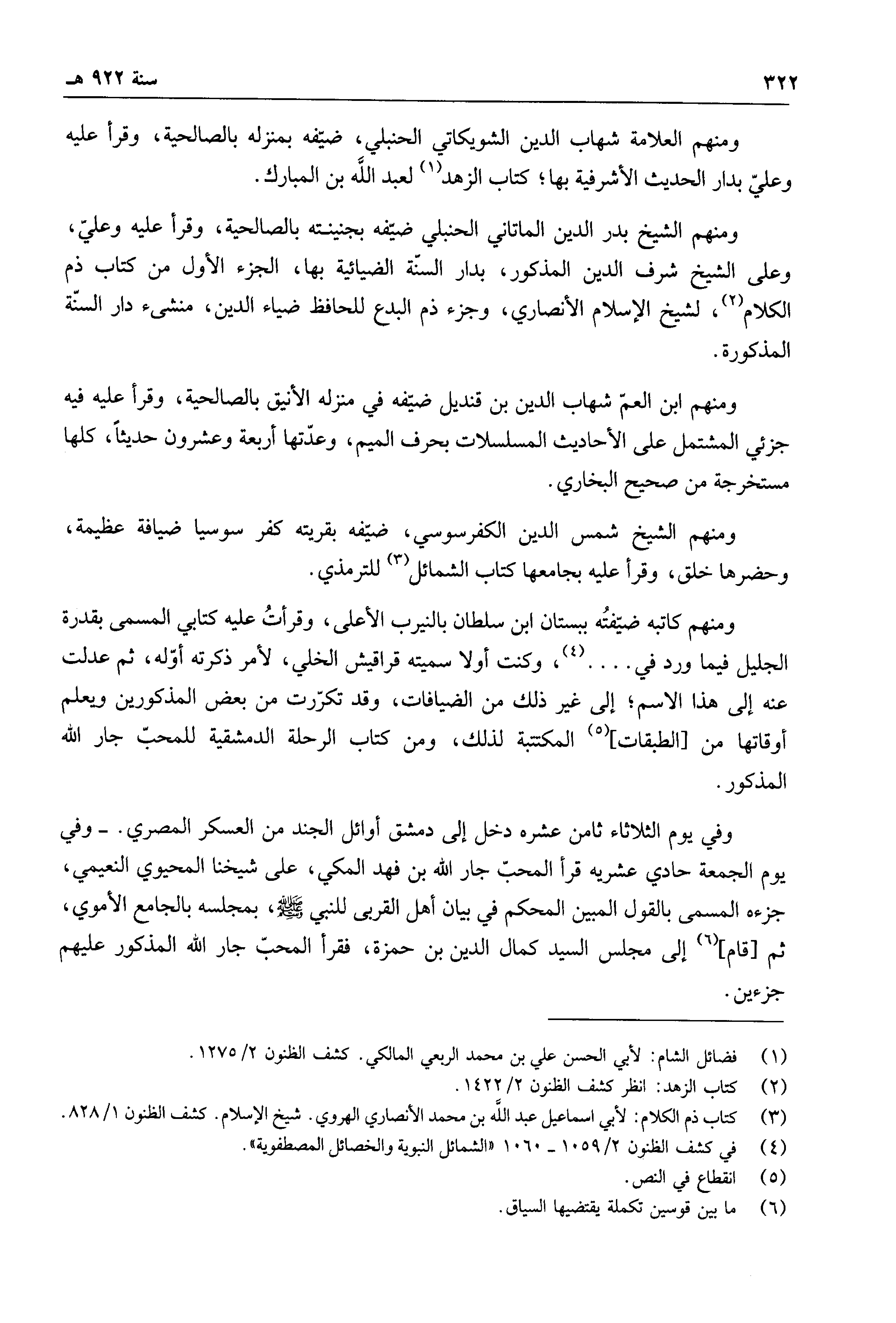 وفي يوم الثلاثاء ثامن عشره دخل إلى دمشق أوائل الجند العسكر المصري. وفي يوم الجمعة حادي عشريه قرأ المحب جار الله بن فهد المكي، على شيخنا المحيوي النعيمي، جزءه المسمى بالقول المبين المحكم في بيان أهل القربى للنبي صلى الله عليه وسلم، بمجلسه بالجامع الأموي، ثم قام إلى مجلس السيد كمال الدين بن حمزة، فقرأ المحب جار الله المذكور عليهم جزءين.