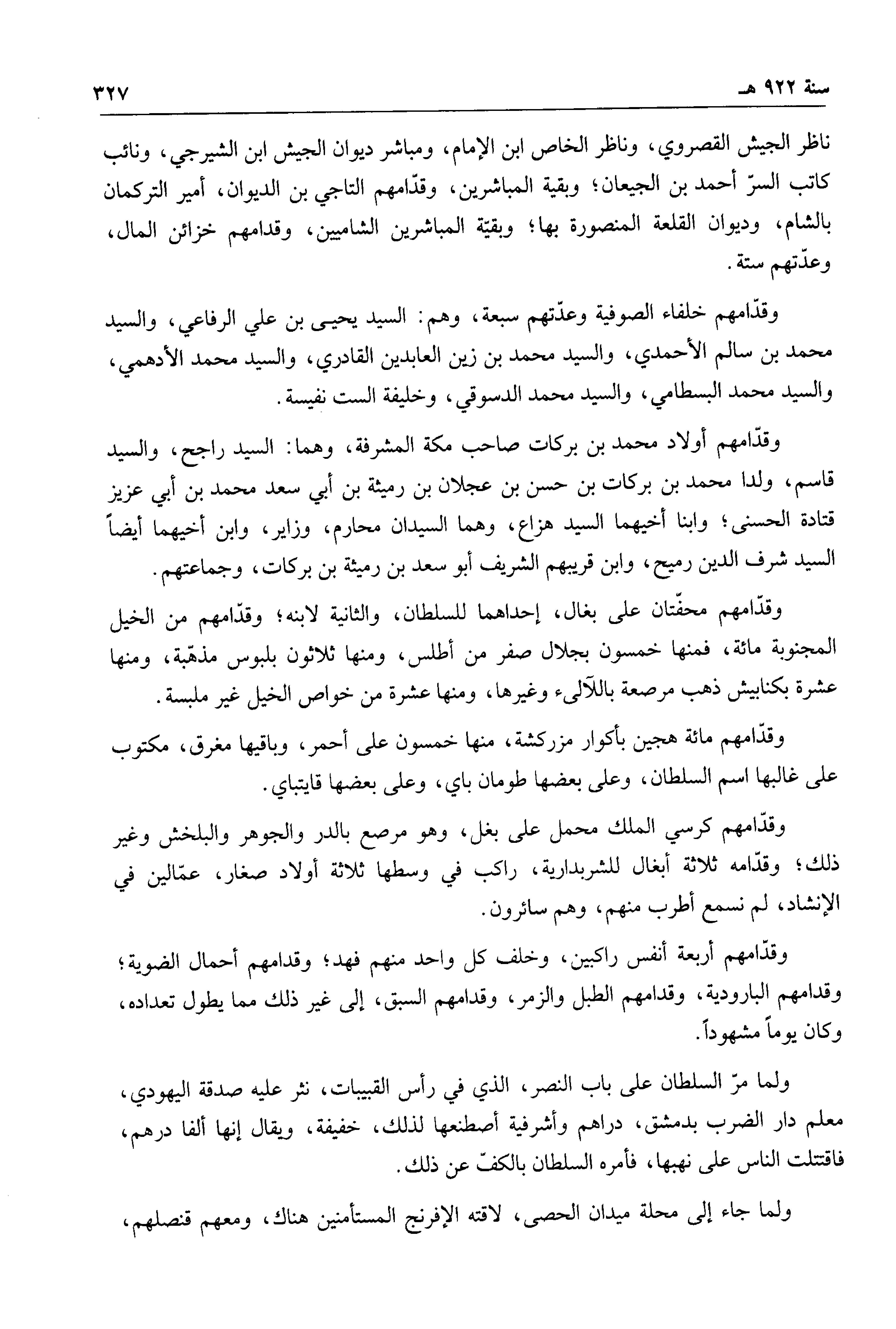 وقدامهم مائة هجين بأكوار مزركشة، منها خمسون على أحمر، وباقيها مغرق، مكتوب على غالبها اسم السلطان، وعلى بعضها طومان باي، وعلى بعضها قايتباي.