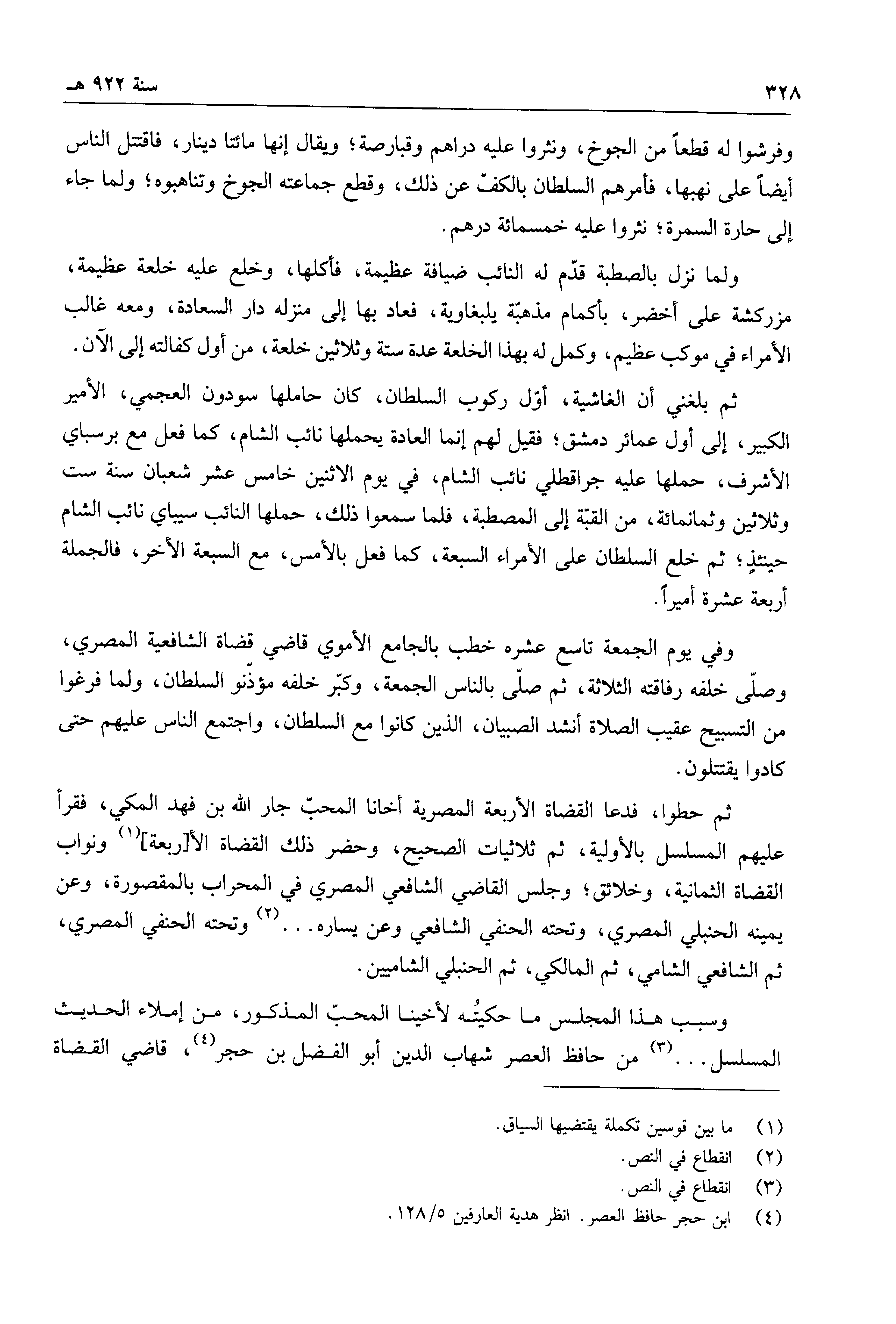 ثم بلغني أن الغاشية، أول ركوب السلطان، كان حاملها سودون العجمي الأمير الكبير، إلى أول عمائر دمشق، فقيل لهم إنما العادة يحملها نائب الشام، كما فعل مع برسباي الأشرف، حملها عليه جراقطلي نائب الشام، في يوم الاثينن خامس عشر شعبان سنة ست وثلاثين وثمانمائة، من القبة إلى المصطبة، فلما سمعوا ذلك، حملها النائب سيباي نائب الشام حينئذٍ، ثم خلع السلطان على الأمراء السبعة، كما فعل بالأمس، مع السبعة الأخر، فالجملة أربعة عشرة أميراً.