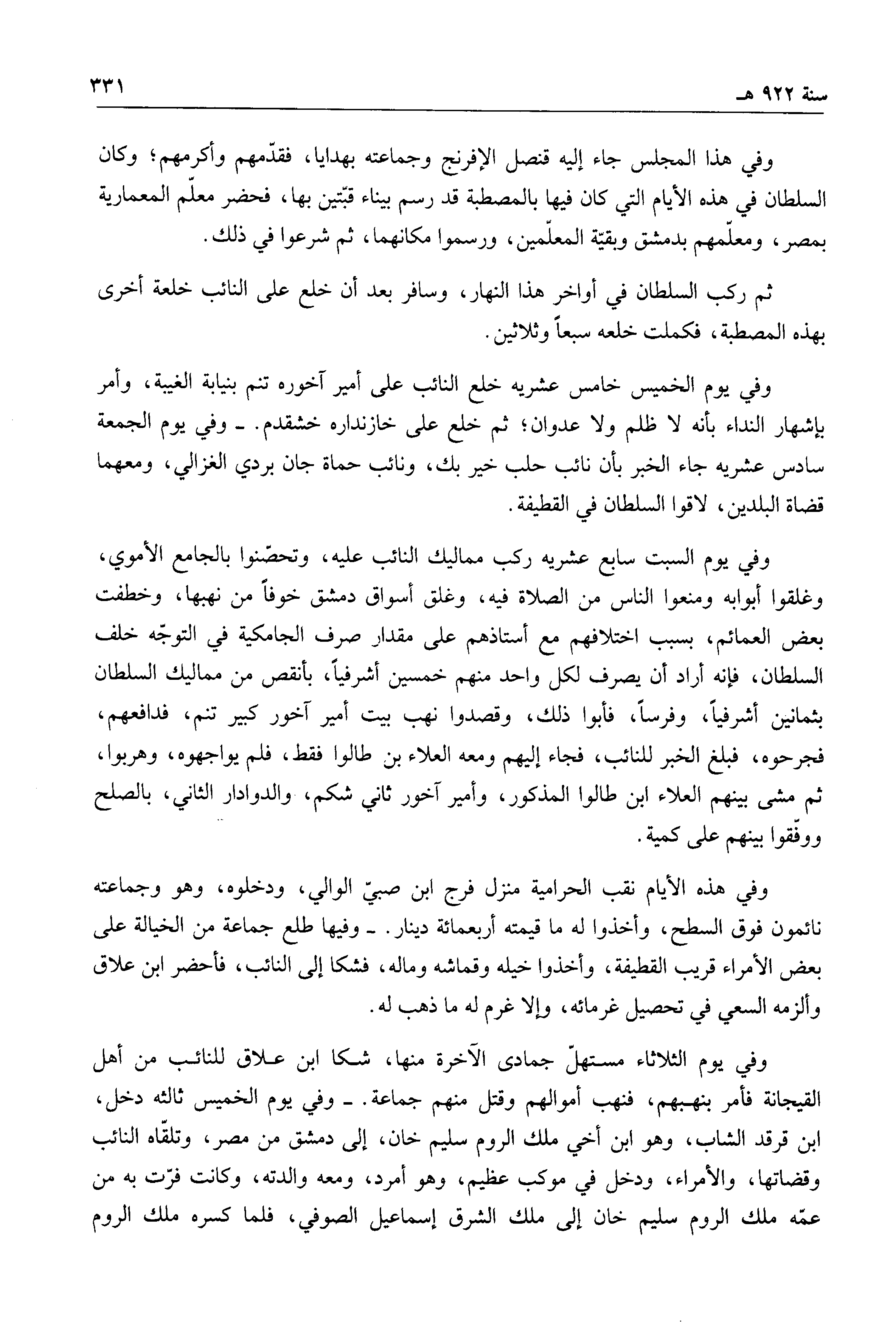 وفي هذه الأيام نقب الحرامية منزل فرج ابن صبّي الوالي، ودخلوه، وهو وجماعته نائمون فوق السطح، وأخذوا له ما قيمته أربعمائة دينار. - وفيها طلع جماعة من الخيالة على بعض الأمراء قريب القطيفة، وأخذوا خيله وقماشه وماله، فشكا إلى النائب، فأحضر ابن علاق وألزمه السعي في تحصيل غرمائه، وإلا غرم له ما ذهب له.