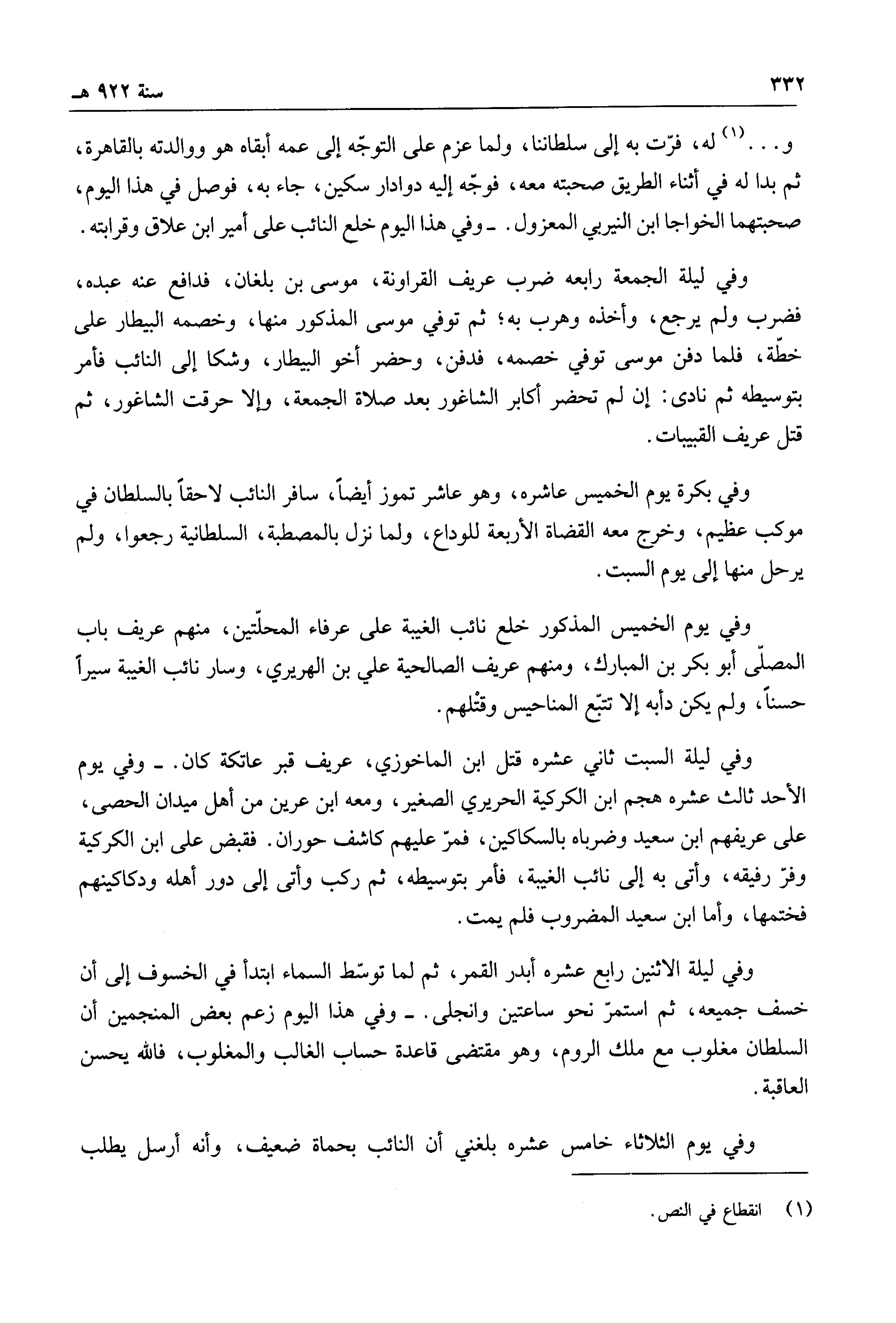 و ... له، فرّت به إلى سلطاننا، ولما عزم على التوجّه إلى عمه أبقاه هو ووالدته بالقاهرة، ثم بدا له في أثناء الطريق صحبته معه، فوجّه إليه دوادار سكين، جاء به، فوصل في هذا اليوم، صحبتهما الخواجا ابن النيربي المعزول. - وفي هذا اليوم خلع النائب على أمير ابن علاق وقرابته.
