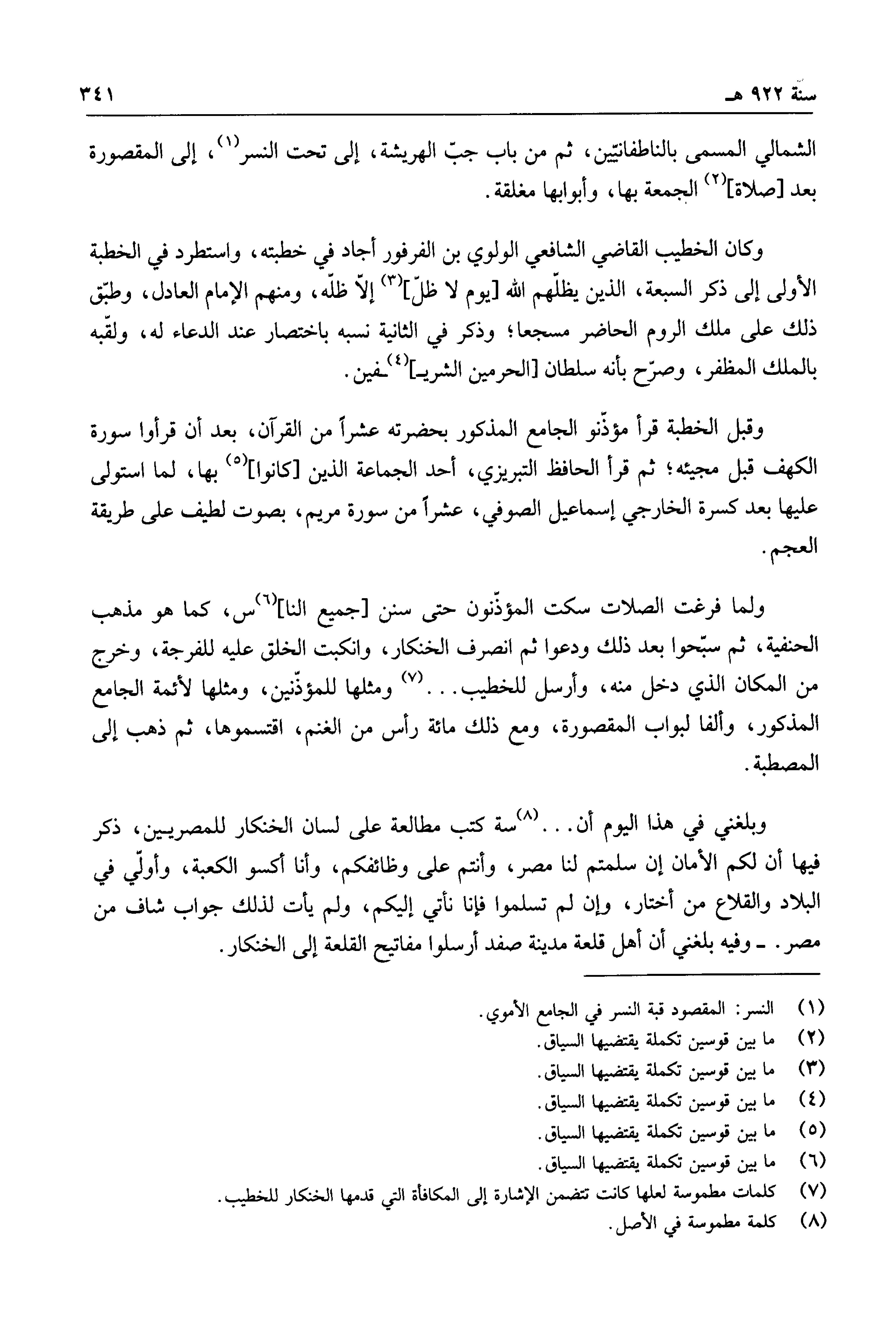 وبلغني في هذا اليوم أن ... سة كتب مطالعة على لسان الخنكار للمصريين، ذكر فيها أن لكم الأمان إن سلمتم لنا مصر، وأنتم على وظائفكم وأنا أكسو الكعبة، وأولي في البلاد والقلاع من أختار، وإن لم تسلموا فإنا نأتي إليكم، ولم يأت لذلك جواب شاف من مصر.