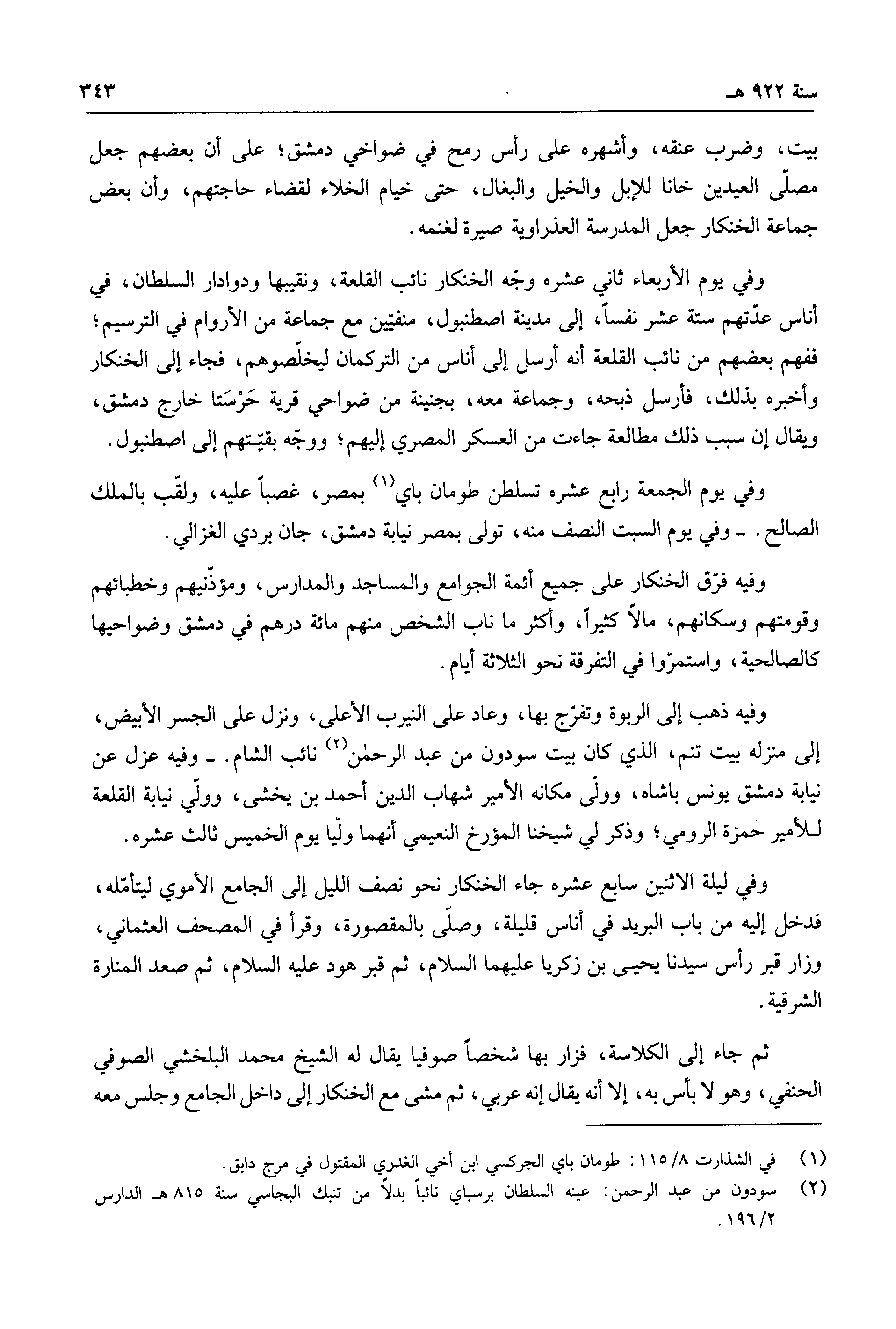 بيت، وضرب عنقه، وأشهره على رأس رمح في ضواخي دمشق؛ على أن بعضهم جعل مصلى العيدين خاناً للإبل والخيل والبغال، حتى خيام الخلاء لقضاء حاجتهم، وأن بعض جماعة الخنكار جعل المدرسة العذراوية صيرة لغنمه.