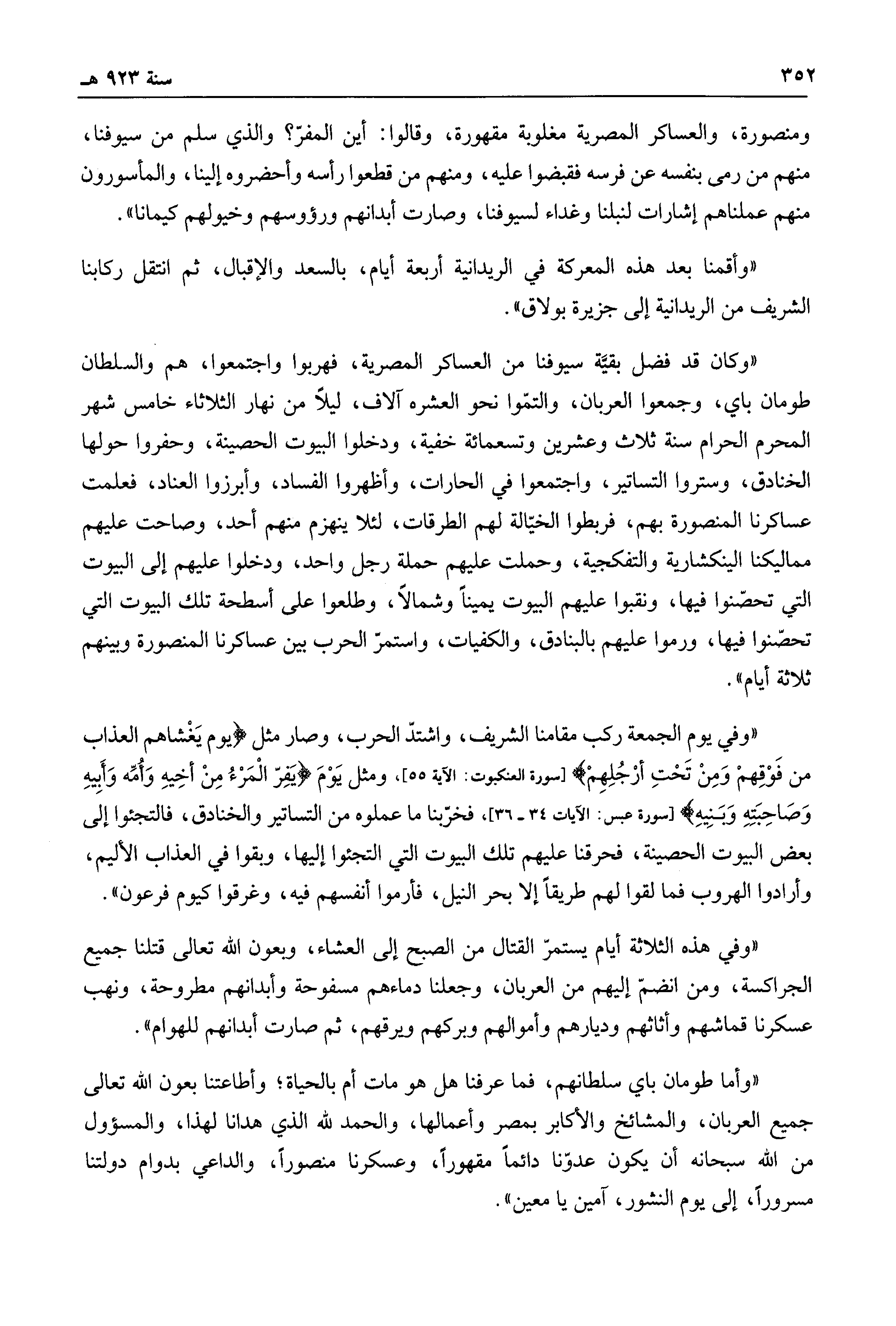 " أما طومان باي سلطانهم، فما عرفنا هل هو مات أم بالحياة؛ وأطاعتنا بعون الله تعالى جميع العربان، والمشائخ والأكابر بمصر وأعمالها، والحمد لله الذي هدانا لهذا، والمسؤول من الله سبحانه أن يكون عدونا دائماً مقهوراً، وعسكرنا منصوراً، والداعي بدوام دولتنا مسروراً، إلى يوم النشور، آمين يا معين ".