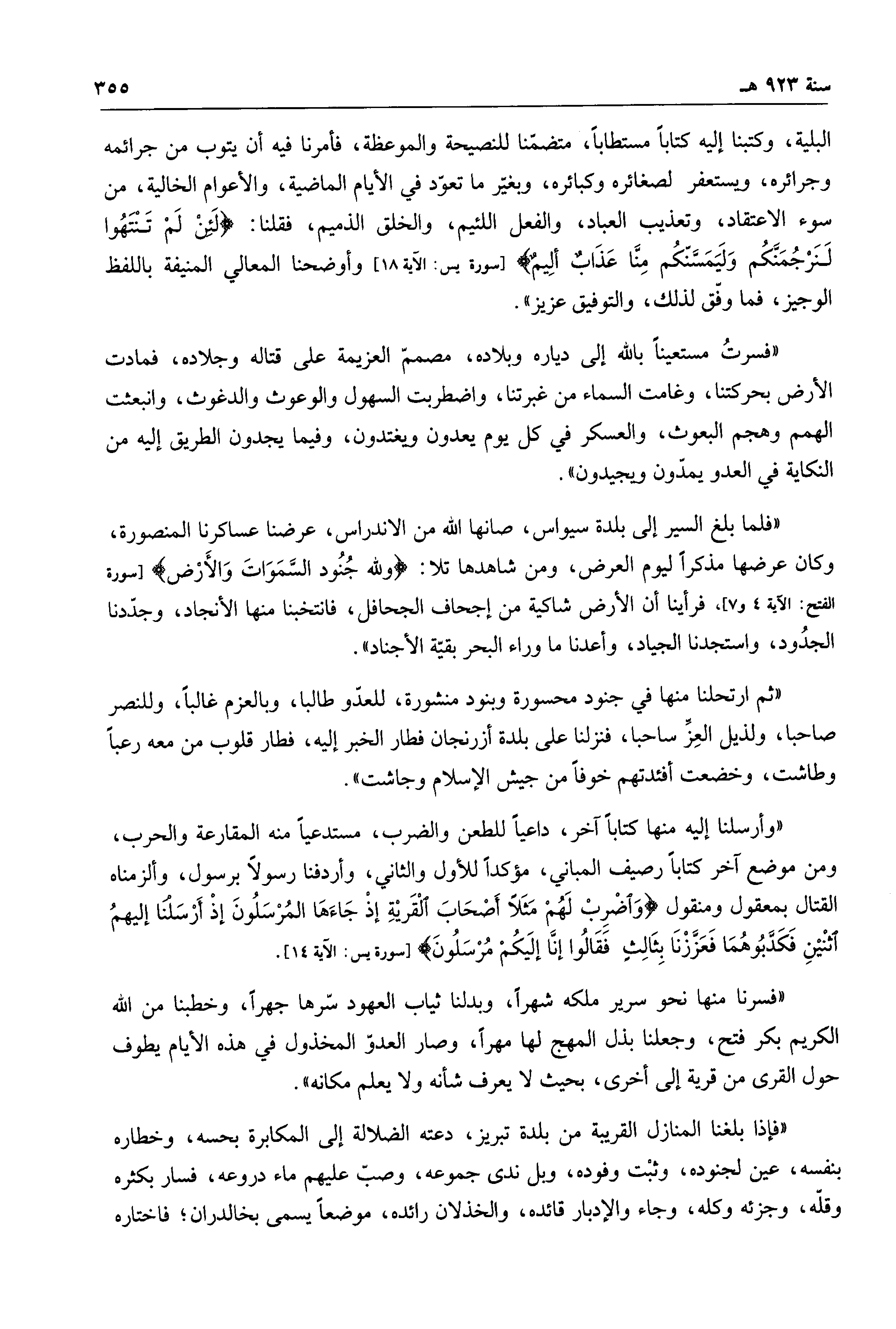 " وأرسلنا إليه منها كتاباً آخر، داعياً للطعن والضرب، مستدعياً منه المقارعة والحرب، ومن موضع آخر كتاباً رصيف المباني، مؤكداً للأول والثاني، وأردفنا رسولاً برسول، وألزمناه القتال بمعقول ومنقول " واضرب لهم مثلاً أصحاب القرية إذ جاءها المرسلون إذ أرسلنا إليهم اثنين فكذبوهما فعززنا بثالث فقالوا إنا إليكم مرسلون ".
