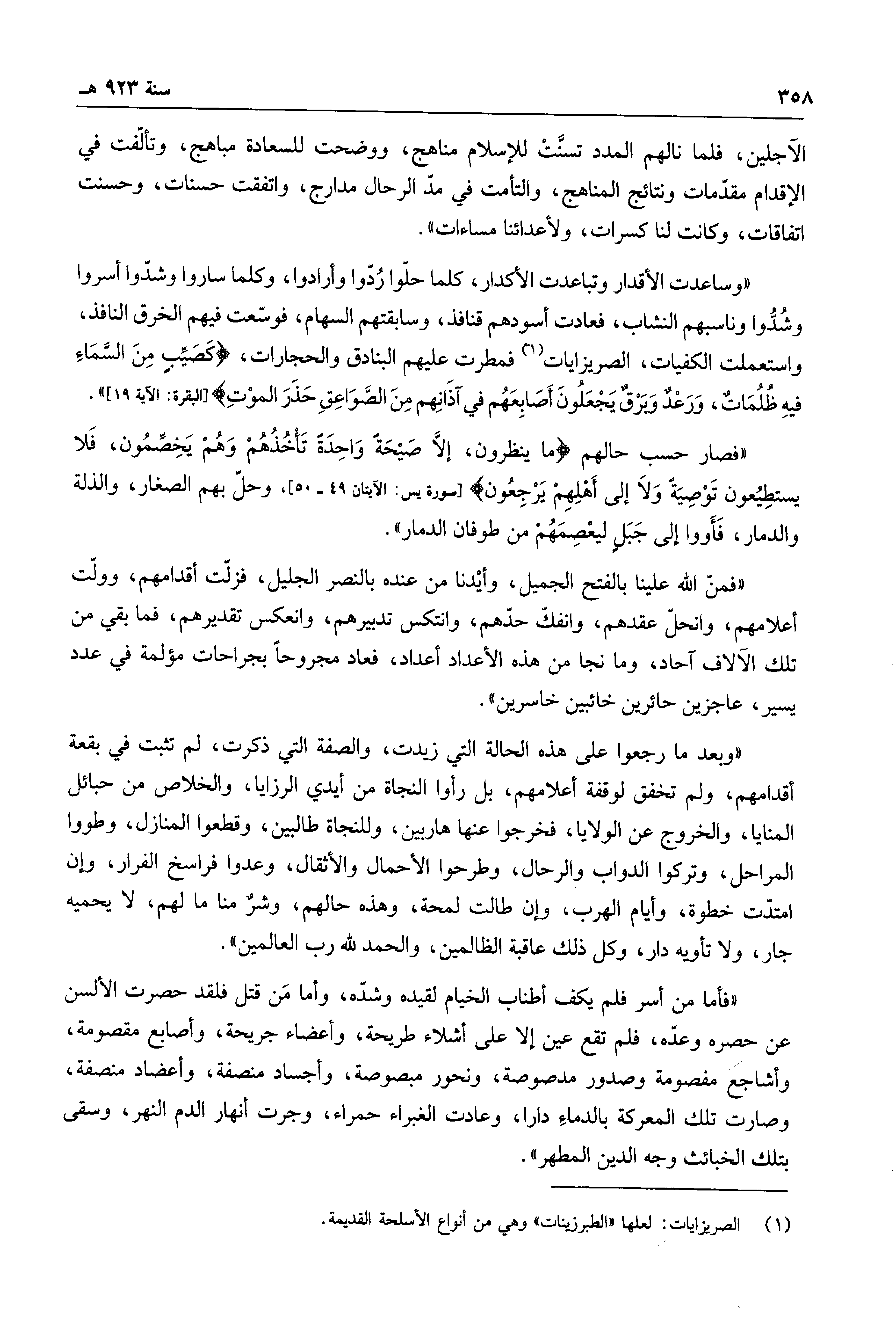 " وساعدت الأقدار وتباعدت الأكدار، كلما حلوا ردوا وأرادوا، وكلما ساروا وشدوا أسروا وشدوا وناسبهم النشاب، فعادت أسودهم قنافذ، وسابقتهم السهام، فوسعت فيهم الخرق النافذ، واستعملت الكفيات، الصريزايات فمطرت عليهم البنادق والحجارات، " كصيبٍ من السماء فيه ظلماتٌ، ورعدٌ وبرقٌ يجعلون أصابعهم في آذانهم من الصواعق حذر الموت ".
