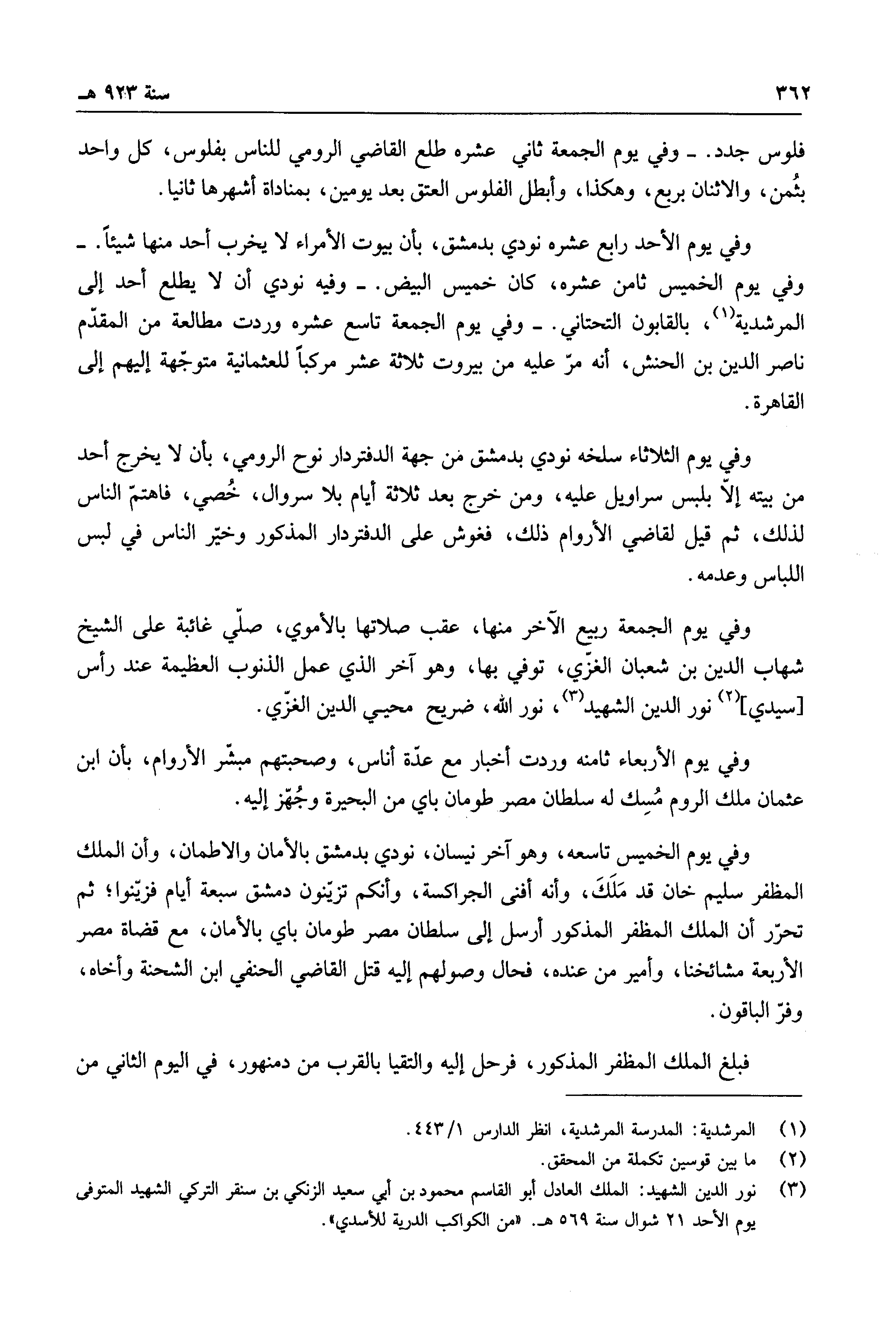 وفي يوم الأحد رابع عشره نودي بدمشق، بأن بيوت الأمراء لا يخرب أحد منها شيئاً. وفي يوم الخميس ثامن عشره، كان خميس البيض. وفيه نودي أن لا يطلع أحد إلى المرشدية، بالقابون التحتاني، وفي يوم الجمعة تاسع عشره وردت مطالعة من المقدم ناصر الدين بن الحنش، أنه مر عليه من بيروت ثلاثة عشر مركباً للعثمانية متوجهة إليهم إلى القاهرة.
