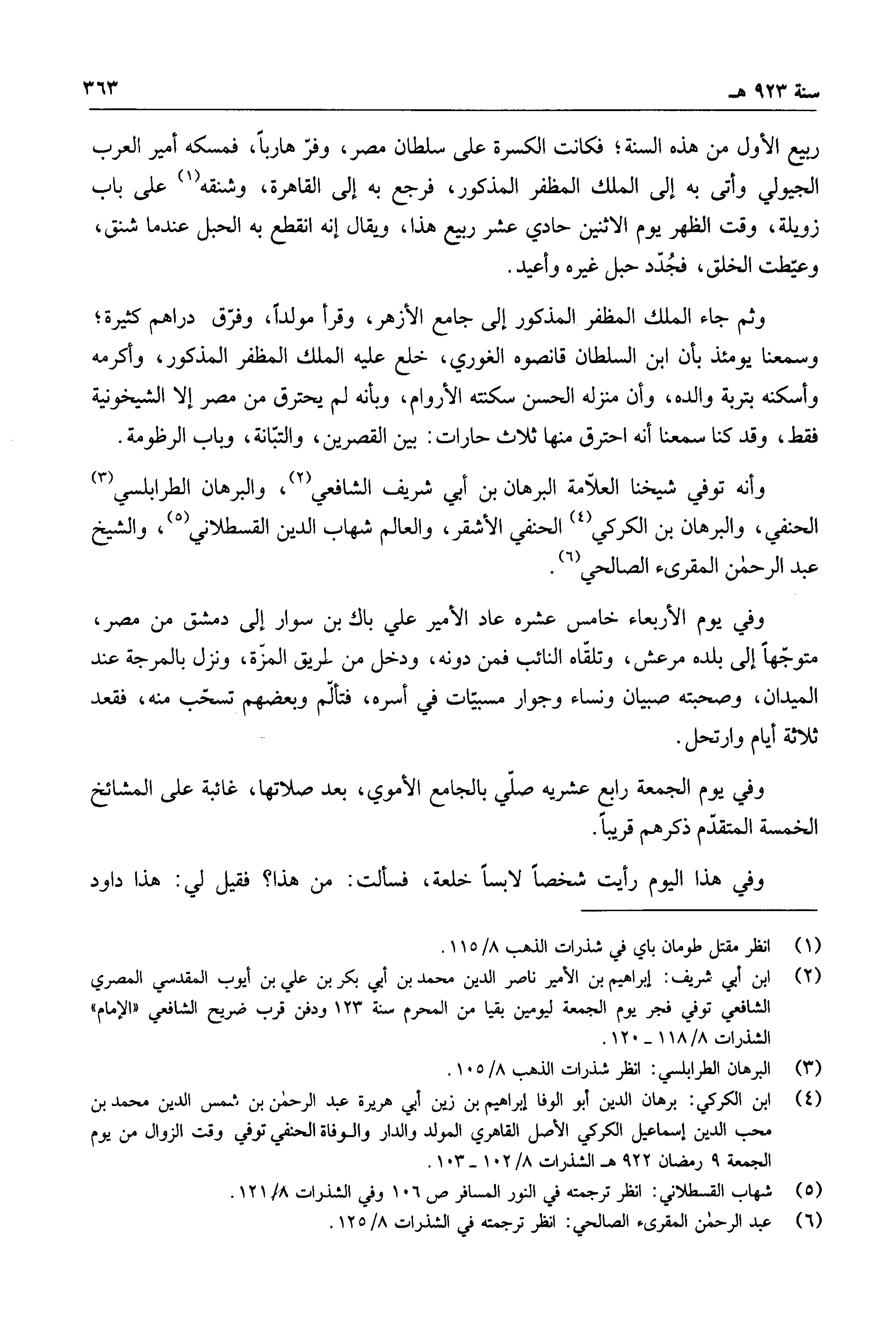 وأنه توفي شيخنا العلامة البرهان بن أبي شريف الشافعي، والبرهان الطرابلسي الحنفي، والبرهان بن الكركي الحنفي الأشقر، والعالم شهاب الدين القسطلاني، والشيخ عبد الرحمن المقرىء الصالحي.