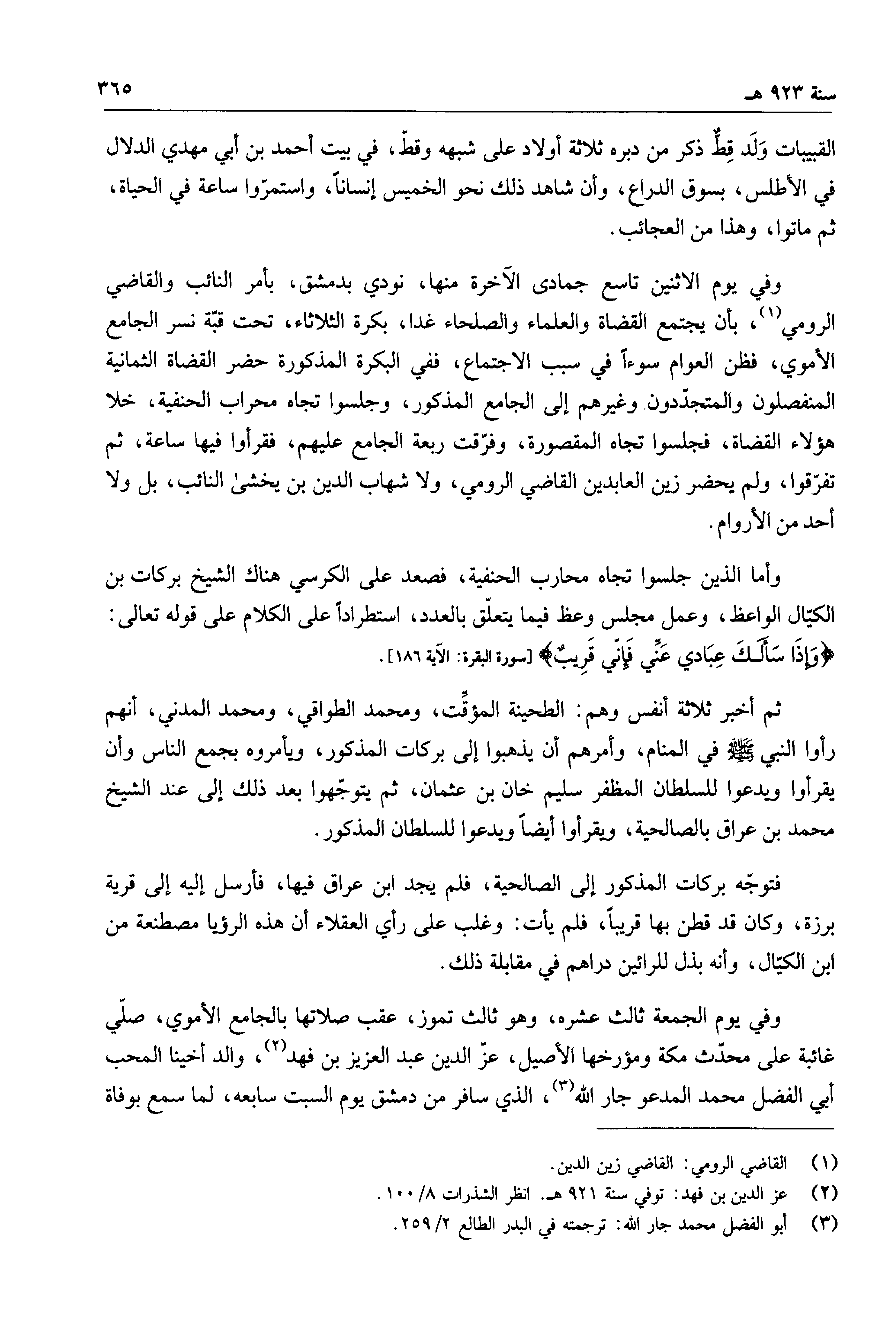 ثم أخبر ثلاثة أنفس وهم: الطحينة المؤقت، ومحمد الطواقي، ومحمد المدني، أنهم رأوا النبي صلى الله عليه وسلم في المنام، وأمرهم أن يذهبوا إلى بركات المذكور، ويأمروه بجمع الناس وأن يقرأوا ويدعوا للسلطان المظفر سليم خان بن عثمان، ثم يتوجهوا بعد ذلك إلى عند الشيخ محمد بن عراق بالصالحية، ويقرأوا أيضاً ويدعوا للسلطان المذكور.