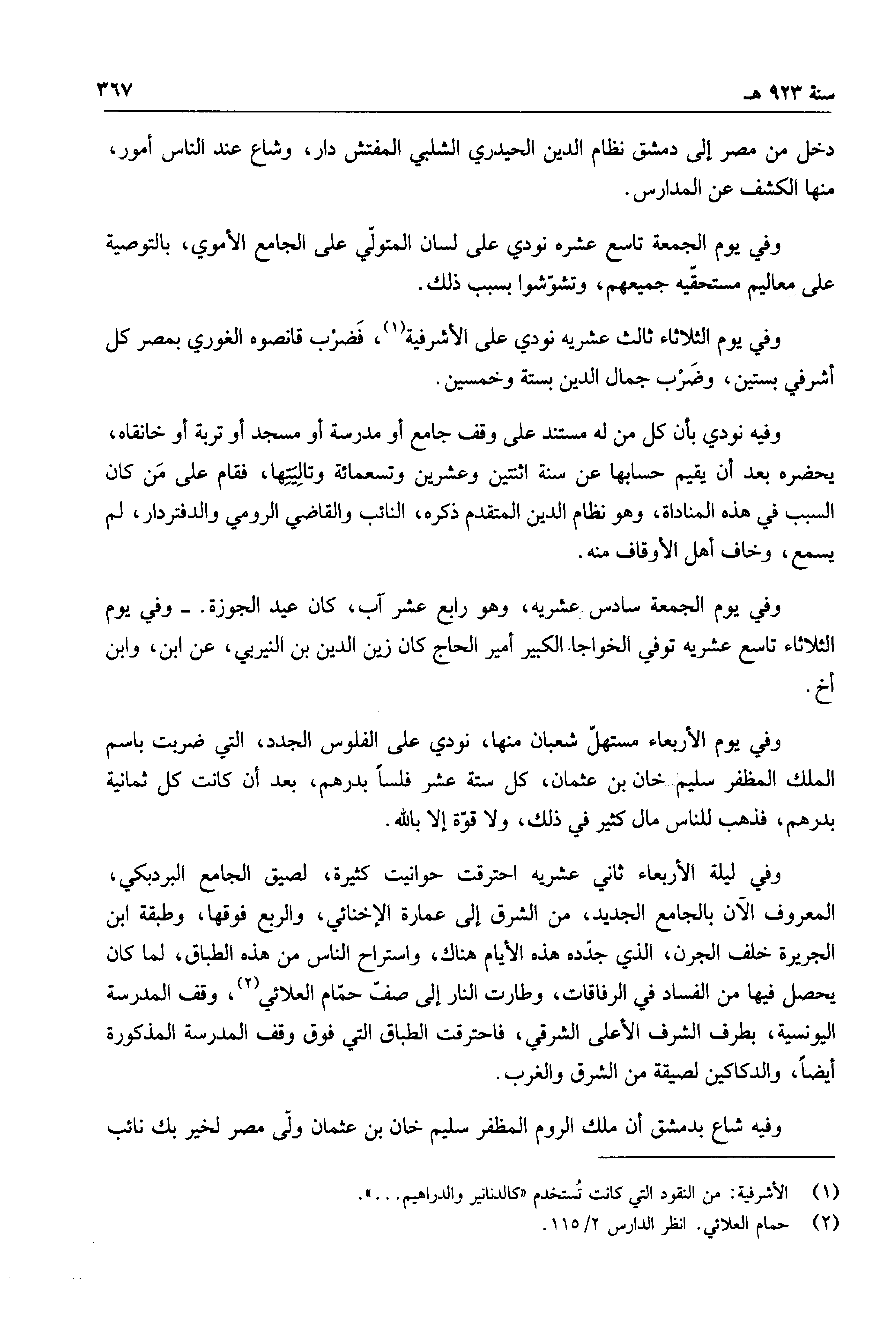 وفيه نودي بأن كل من له مستند على وقف جامع أو مدرسة أو مسجد أو تربة أو خانقاه، بحضره بعد أن يقيم حسابها عن سنة اثنتين وعشرين وتسعمائة وتاليتها، فقام على من كان السبب في هذه المناداة، وهو نظام الدين المتقدم ذكره، النائب والقاضي الرومي والدفتردار، لم يسمع، وخاف أهل الأوقاف منه.
