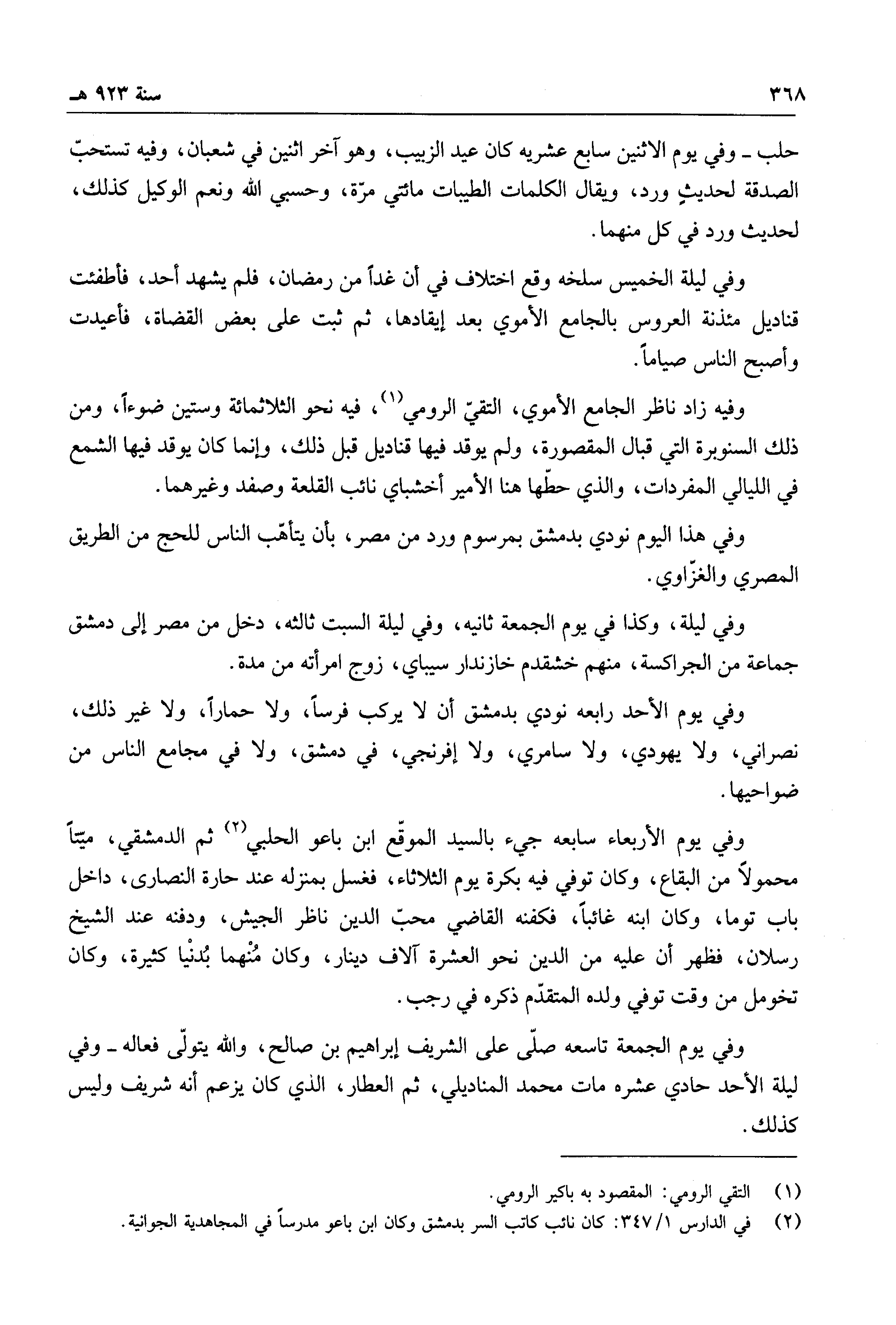 وفيه زاد ناظر الجامع الأموي، التقي الرومي، فيه نحو الثلاثمائة وستين ضوءاً، ومن ذلك السنوبرة التي قبال المقصورة، ولم يوقد فيها قناديل قبل ذلك، وإنما كان يوقد فيها الشمع في الليالي المفردات، والذي حطها هنا الأمير أخشباي نائب القلعة وصفد وغيرهما.