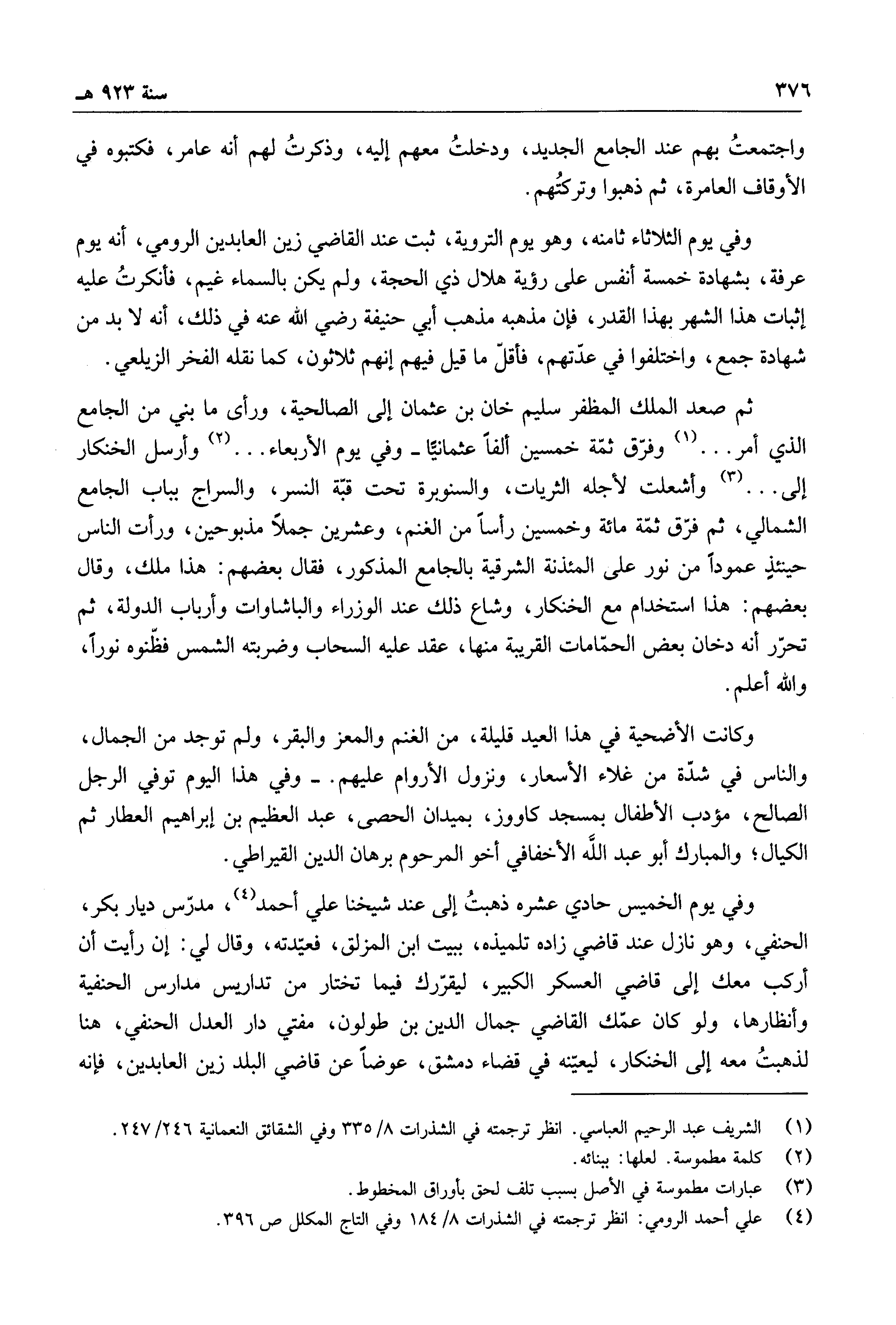 ثم صعد الملك المظفر سليم خان بن عثمان إلى الصالحية، ورأى ما بني من الجامع الذي امر ... وفرق ثمة خمسين ألفاً عثمانياً - وفي يوم الأربعاء ... وأرسل الخنكار إلى ... وأشعلت لأجله الثريات، والسنوبرة تحت قبة النسر، والسراج بباب الجامع الشمالي، ثم فرق ثمة مائة وخمسين رأساً من الغنم، وعشرين جملاً مذبوحين، ورأت الناس حينئذٍ عموداً من نور على المئذنة الشرقية بالجامع المذكور، فقال بعضهم: هذا ملك، وقال بعضهم: هذا استخدام مع الخنكار، وشاع ذلك عند الوزراء والباشاوت وأرباب الدولة، ثم تحرر أنه دخان بعض الحمامات القريبة منها، عقد عليه السحاب وضربته الشمس فظنوه نوراً، والله أعلم.