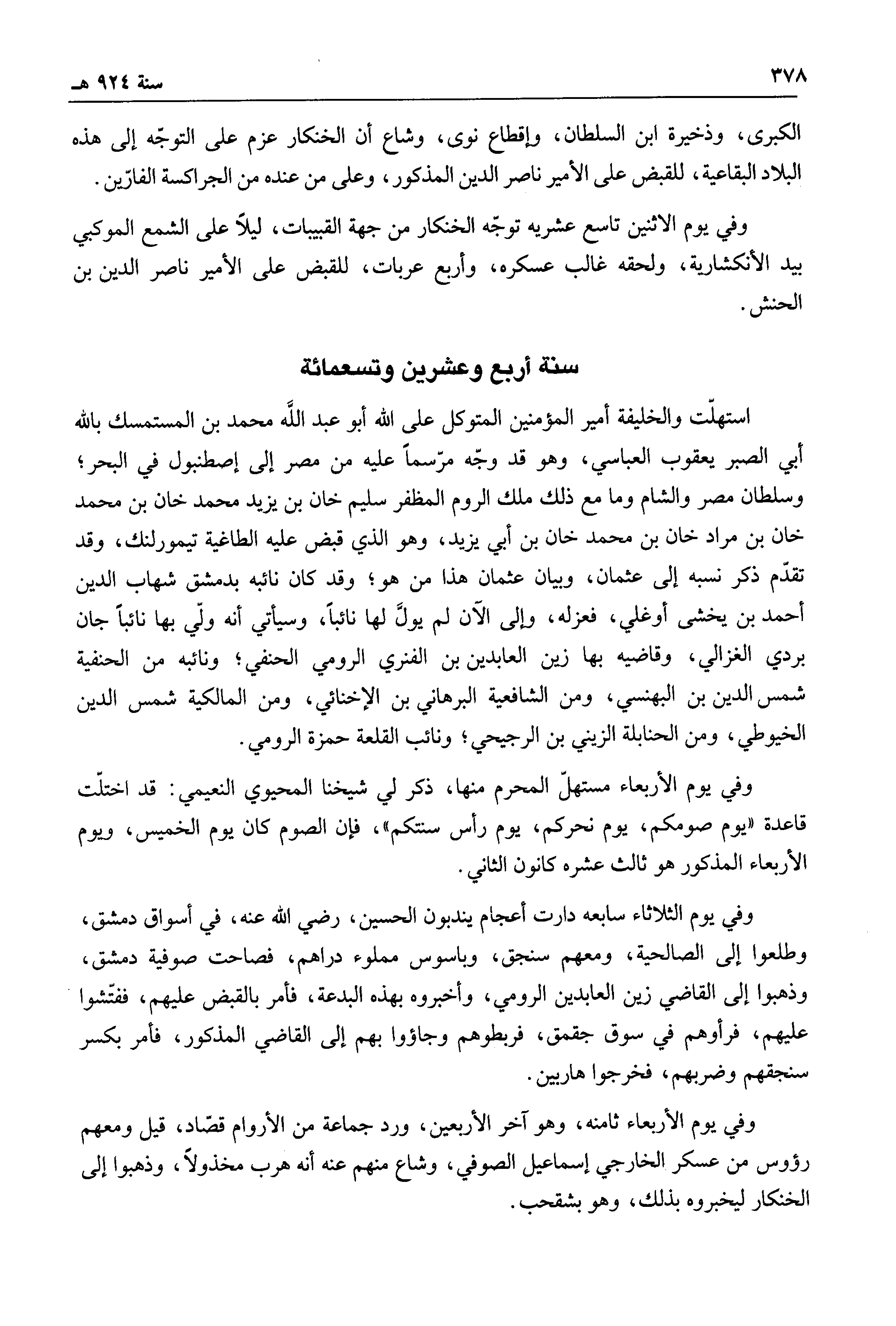 استهلّت والخليفة أمير المؤمنين المتوكل على الله أبو عبد الله محمد بن المستمسك بالله أبي الصبر يعقوب العباسي، وهو قد وجّه مرّسماً عليه من مصر إلى إصطنبول في البحر؛ وسلطان مصر والشام وما مع ذلك ملك الروم المظفر سليم خان بن يزيد محمد خان بن محمد خان بن مراد خان بن محمد خان بن أبي يزيد، وهو الذي قبض عليه الطاغية تيمورلنك، وقد تقدّم ذكر نسبه إلى عثمان، وبيان عثمان هذا من هو؛ وقد كان نائبه بدمشق شهاب الدين أحمد بن يخشى أوغلي، فعزله، وإلى الآن لم يولّ لها نائباً، وسيأتي أنه ولّي بها نائباً جان بردي الغزالي، وقاضيه بها زين العابدين بن الفنري الرومي الحنفي؛ ونائبه من الحنفية شمس الدين بن البهنسي، ومن الشافعية البرهاني بن الإخنائي، ومن المالكية شمس الدين الخيوطي، ومن الحنابلة الزيني بن الرجيحي؛ ونائب القلعة حمزة الرومي.