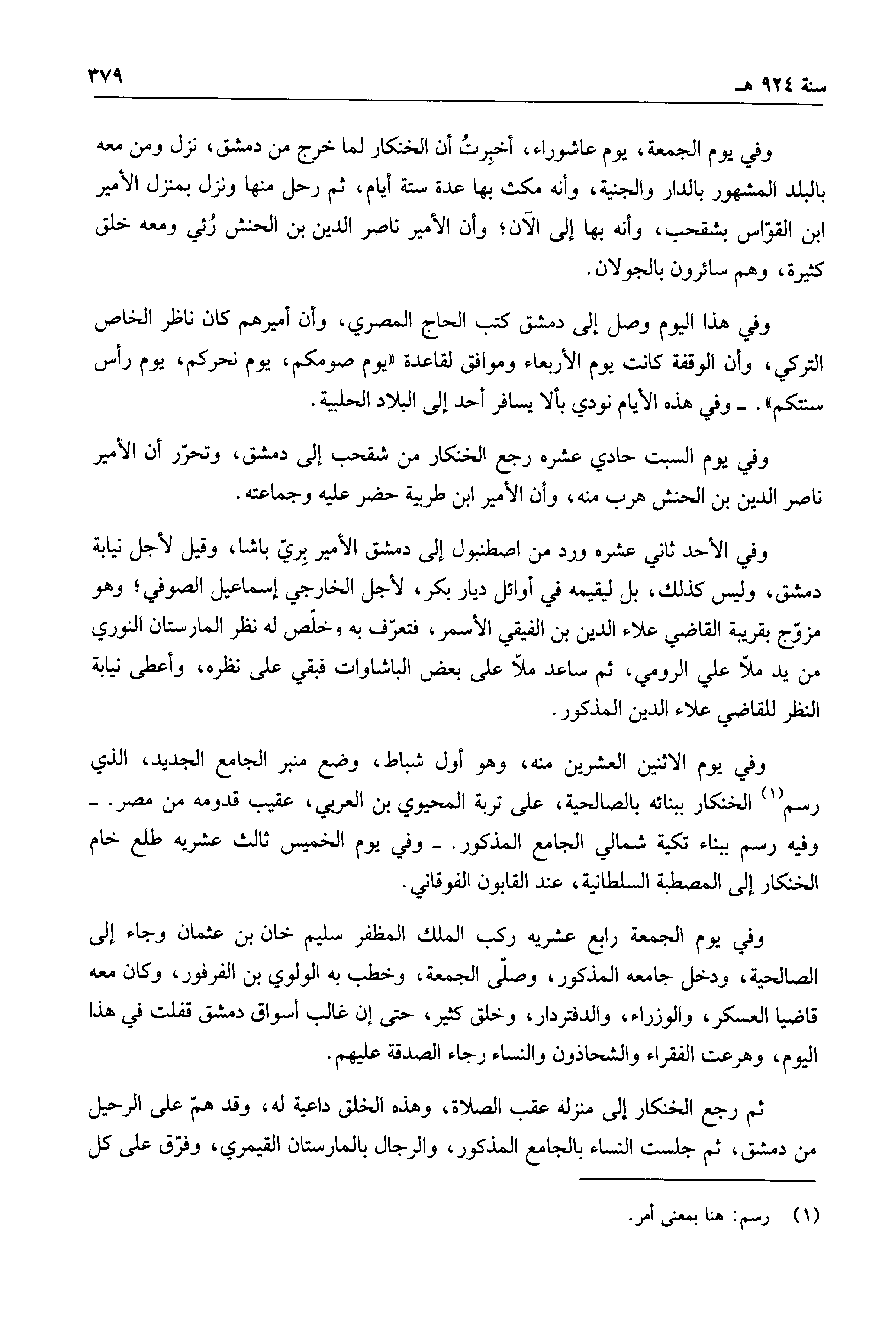 وفي يوم الجمعة، يوم عاشوراء، أخبرت أن الخنكار لما خرج من دمشق، نزل ومن معه بالبلد المشهور بالدار والجنية، وأنه مكث بها عدة ستة أيام، ثم رحل منها ونزل بمنزل الأمير ابن القوّاس بشقحب، وأنه بها إلى الآن؛ وأن الأمير ناصر الدين بن الحنش رئي ومعه خلق كثيرة، وهم سائرون بالجولان.