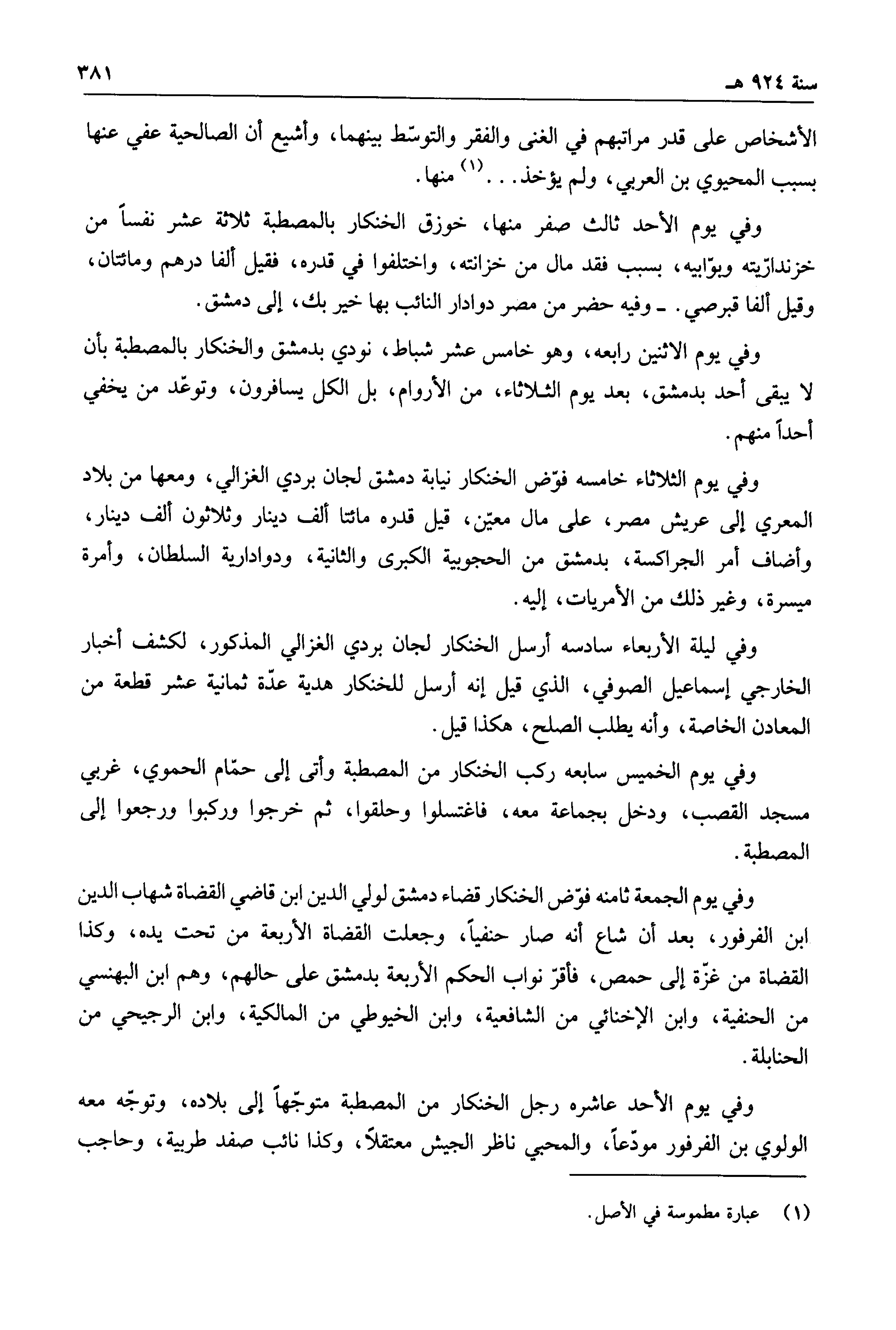 وفي يوم الثلاثاء خامسه فوض الخنكار نيابة دمشق لجان بردي الغزالي، ومعها من بلاد المعري إلى عريش مصر، على مال معين، قيل قدره مائتا ألف دينار وثلاثون ألف دينار، وأضاف أمر الجراكسة، بدمشق من الحجوبية والكبرى والثانية، ودوادارية السلطان، وأمرة ميسرة، وغير ذلك من الأمريات، إليه.