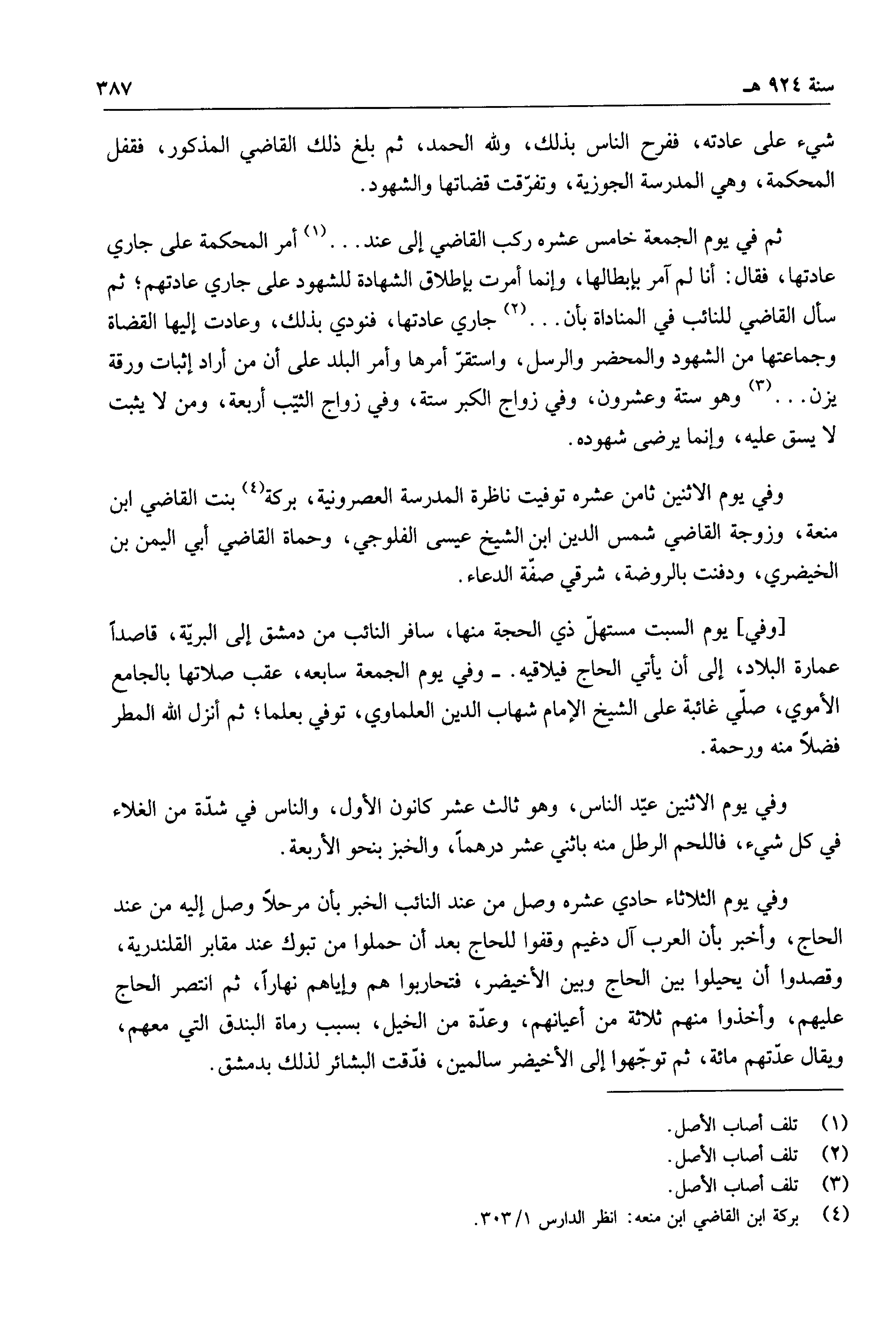 ثم في يوم الجمعة خامس عشره ركب القاضي إلى عند ... أمر المحكمة على جاري عادتها، فقال: أنا لم آمر بإبطالها، وإنما أمرت بإطلاق الشهادة للشهود على جاري عادتهم، ثم سأل القاضي للنائب في المناداة بأن ... جاري عادتها، فنودي بذلك، وعادت إليها القضاة وجماعتها من الشهود والمحضر والرسل، واستقر أمرها وأمر البلد على أن من أراد إثبات ورقة يزن ... وهو ستة وعشرون، وفي زواج الكبر ستة، وفي زواج الثيب أربعة ومن لا يثبت لا يسق عليه، وإنما يرضى شهوده.
