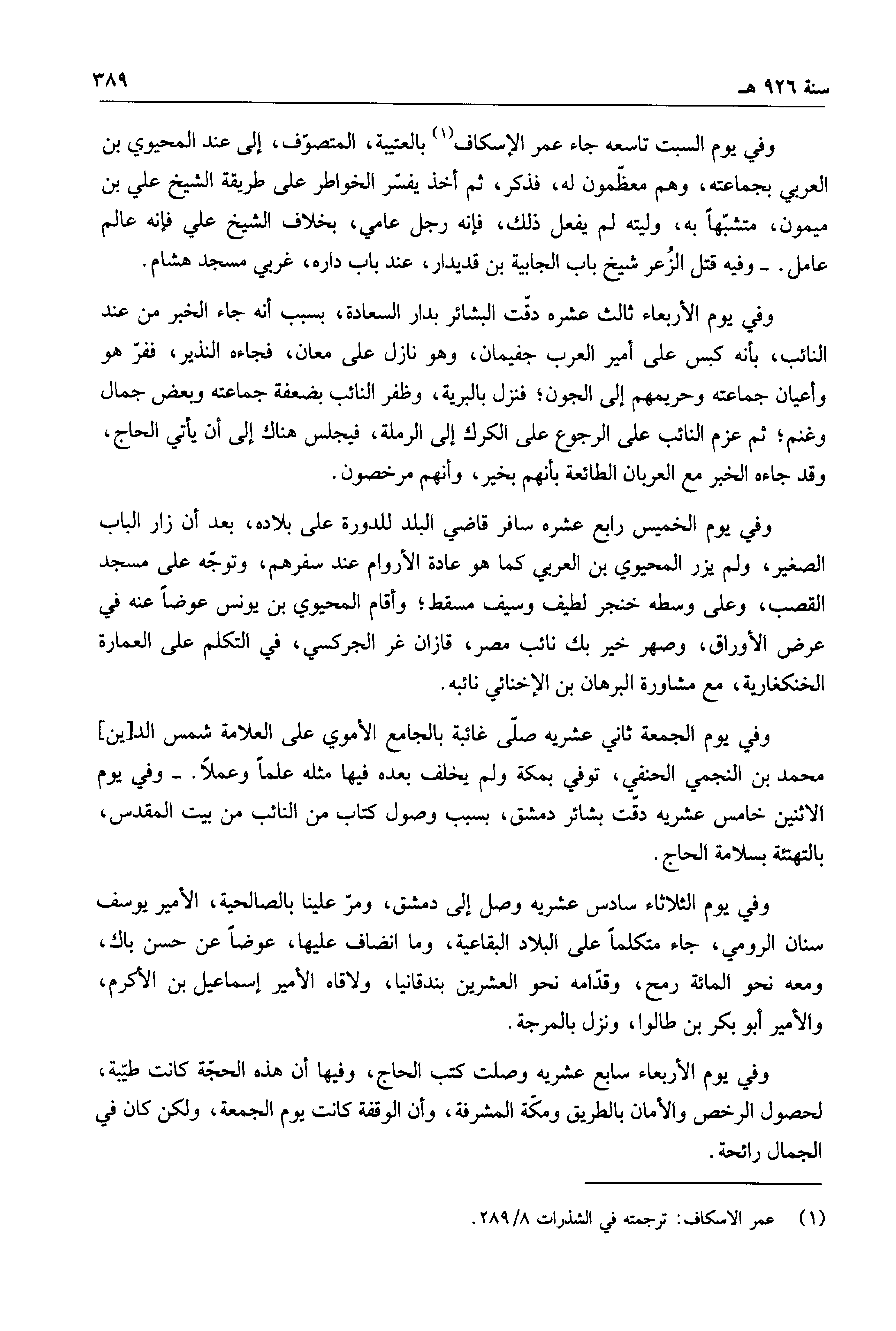 وفي يوم السبت تاسعه جاء عمر الإسكاف بالعتيبة، المتصوف، إلى عند المحيوي بن العربي بجماعته، وهم معظمون له، فذكر، ثم أخذ يفسر الخواطر على طريقة الشيخ علي بن ميمون، متشبهاً به، وليته لم يفعل ذلك، فإنه رجل عامي، بخلاف الشيخ علي فإنه عالم عامل. وفيه قتل الزعر شيخ باب الجابية بن قديدار، عند باب داره، غربي مسجد هشام.