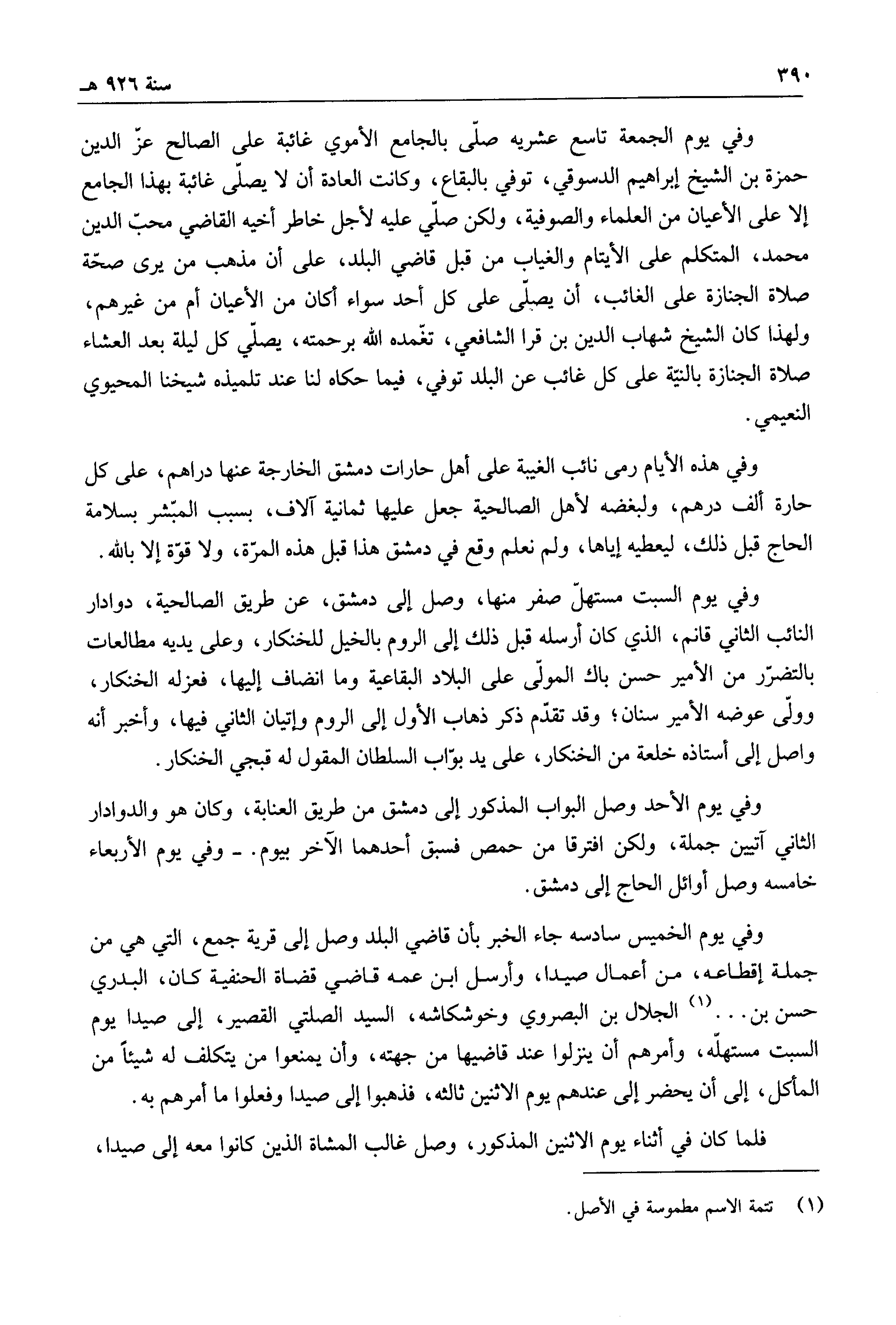 وفي يوم الجمعة تاسع عشريه صلي بالجامع الأموي غائبة على الصالح عز الدين بن حمزة بن الشيخ إبراهيم الدسوقي، توفي بالبقاع، وكانت العادة أن لا يصلى غائبة بهذا الجامع إلا على الأعيان من العلماء والصوفية، ولكن صلي عليه لأجل خاطر أخيه القاضي محب الدين محمد، المتكلم على الأيتام والغياب، من قبل قاضي البلد، على أن مذهب من يرى صحة صلاة الجنازة على الغائب، وأن يصلى على كل أحد سواء أكان من الأعيان أم من غيرهم، ولهذا كان الشيخ شهاب الدين بن قرا الشافعي، تغمده الله برحمته، يصلي كل ليلة بعد العشاء صلاة الجنازة بالنية على كل غائب عن البلد توفي، فيما حكاه لنا عند تلميذه شيخنا المحيوي النعيمي.
