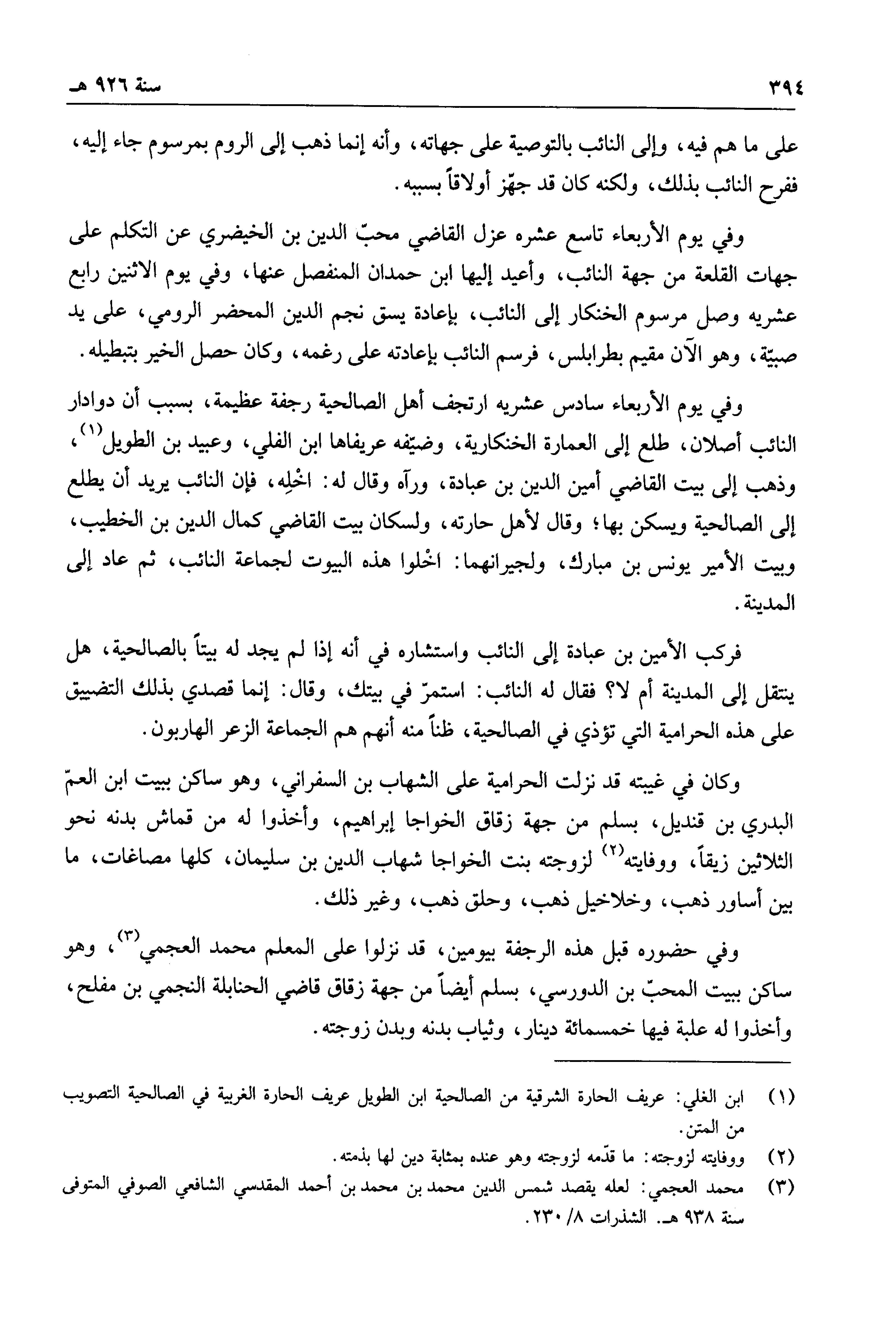 وفي حضوره قبل هذه الرجفة بيومين، قد نزلوا على المعلم محمد العجمي، وهو ساكن ببيت المحبّ بن الدورسي، بسلم أيضاً من جهة زقاق قاضي الحنابلة النجمي بن مفلح، وأخذوا له علبة فيها خمسمائة دينار، وثياب بدنه وبدن زوجته.
