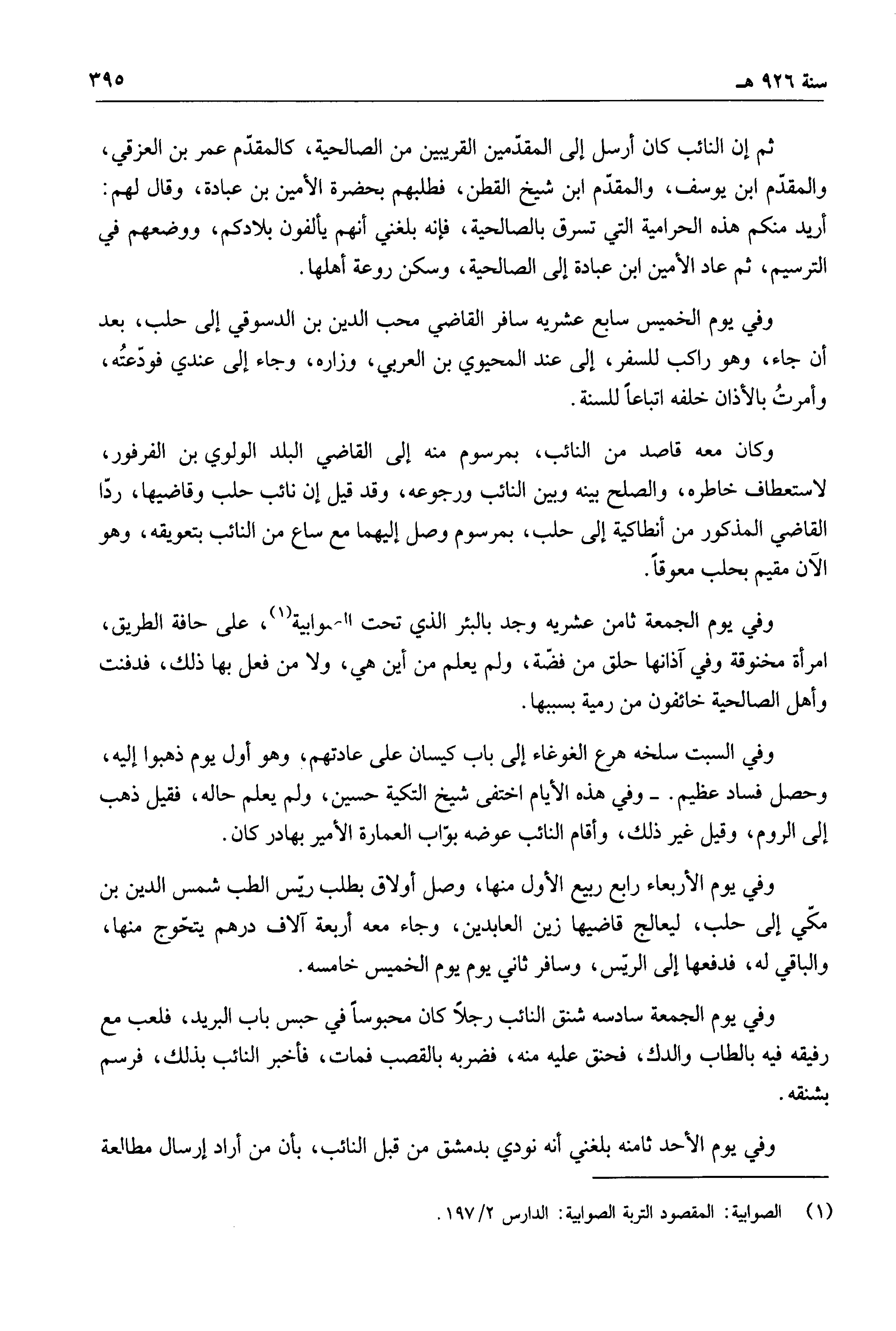 وكان معه قاصد من النائب، بمرسوم منه إلى القاضي البلد الولوي بن الفرفور، لاستعطاف خاطره، والصلح بينه وبين النائب ورجوعه، وقد قيل إن نائب حلب وقاضيها، ردّا القاضي المذكور من أنطاكية إلى حلب، بمرسوم وصل إليهما مع ساع من النائب بتعويقه، وهو الآن مقيم بحلب معوقاً.