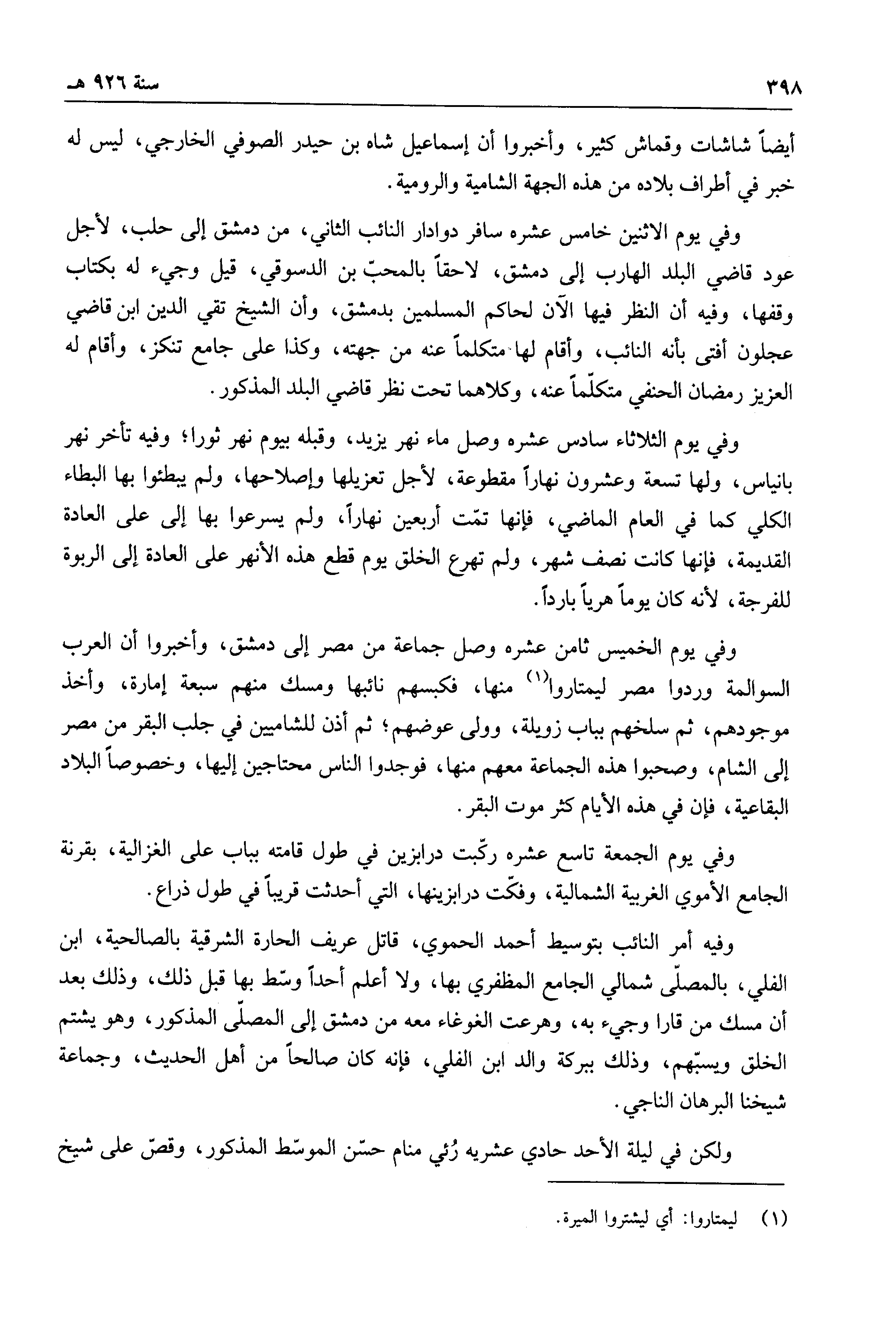 أيضاً شاشات وقماش كثير، وأخبروا إن إسماعيل شاه بن حيدر الصوفي الخارجي، ليس له خبر في أطراف بلاده من هذه الجهة الشامية والرومية.