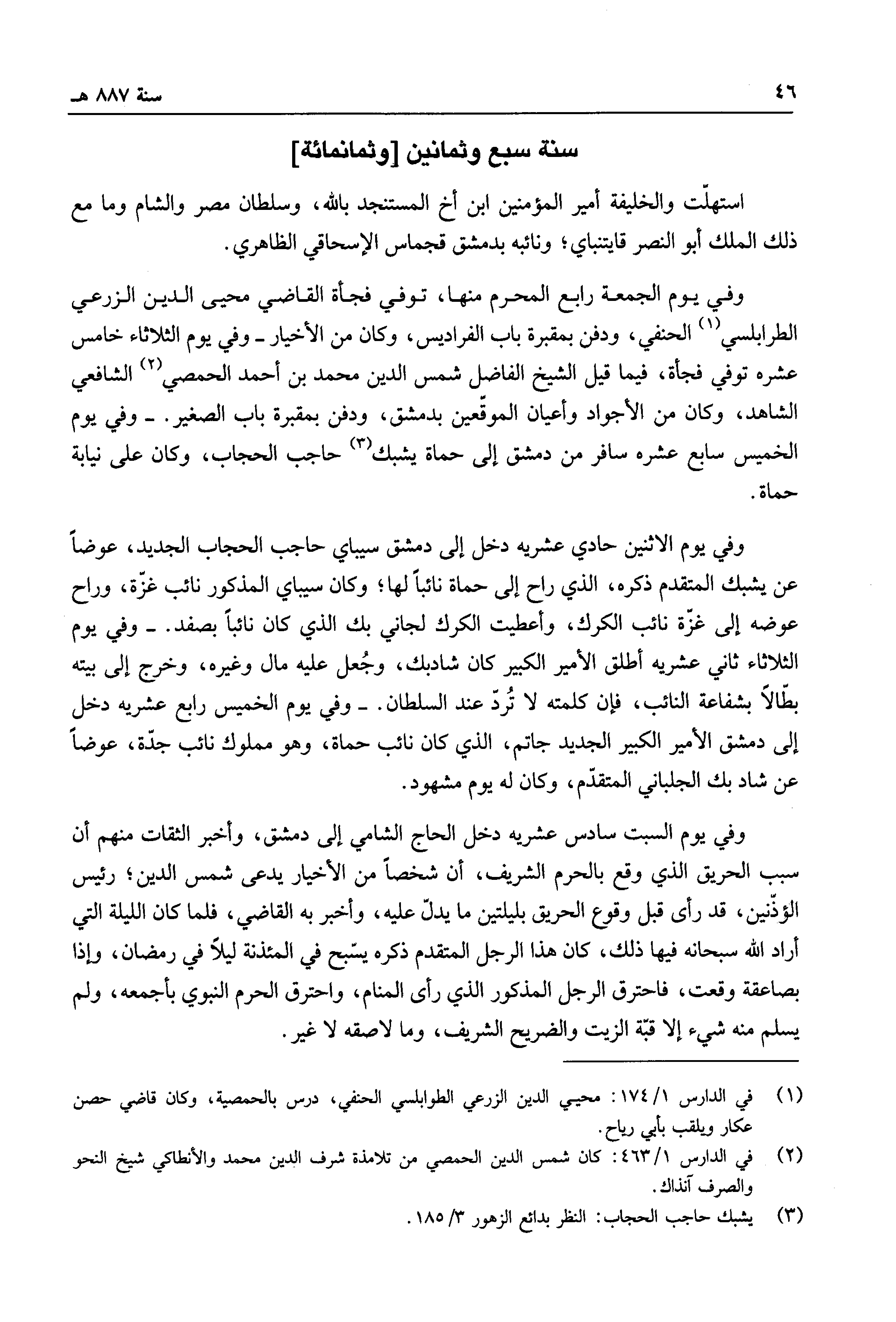 استهلت والخليفة أمير المؤمنين ابن أخ المستنجد بالله، وسلطان مصر والشام وما مع ذلك الملك أبو النصر قايتنباي؛ ونائبه بدمشق قجماس الإسحاقي الظاهري.