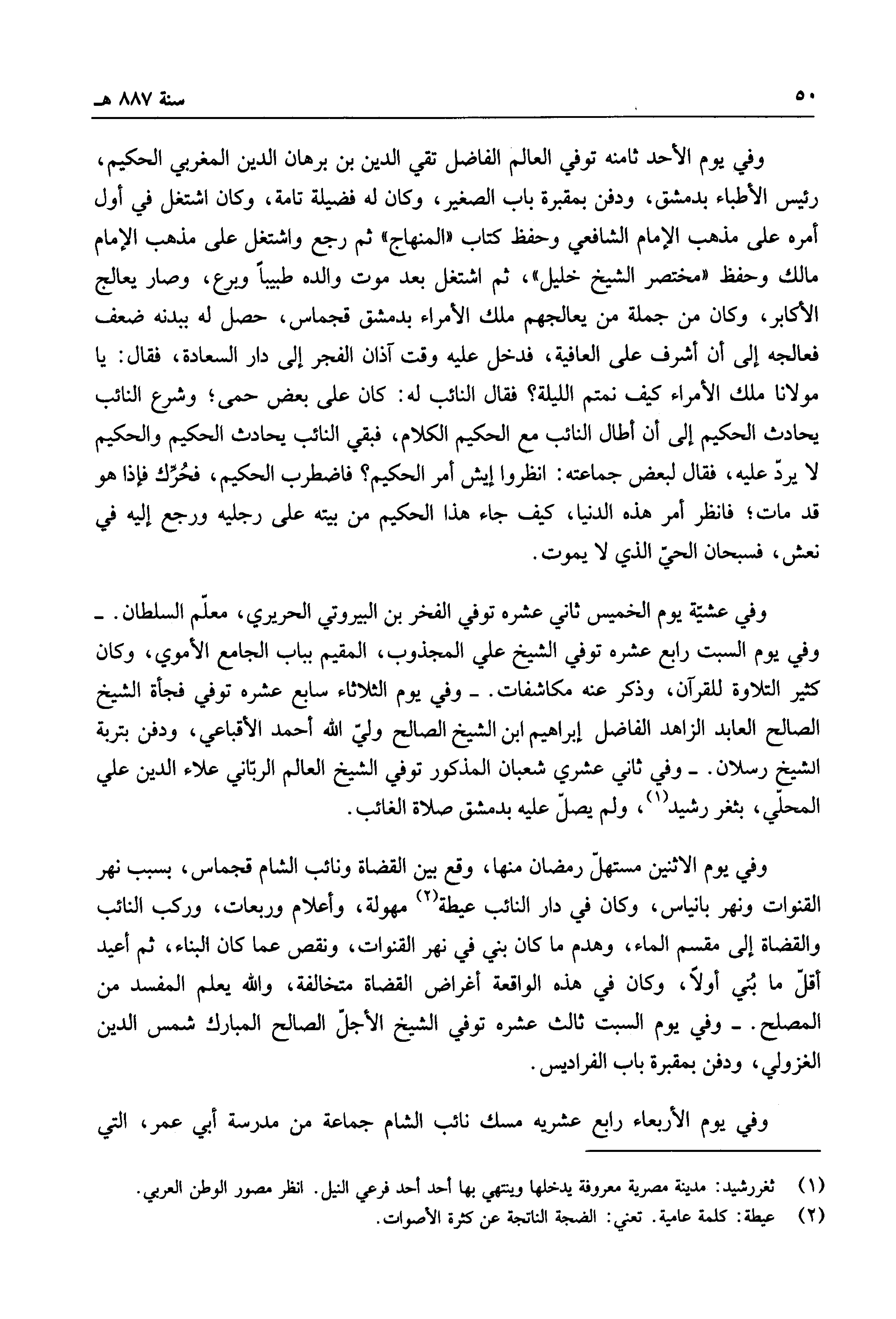 وفي عشية يوم الخميس ثاني عشره توفي الفخر بن البيروتي الحريري، معلم السلطان. وفي يوم السبت رابع عشره توفي الشيخ علي المجذوب، المقيم بباب الجامع الأموي وكان كثير التلاوة للقرآن، وذكر عنه مكاشفات. - وفي يوم الثلاثاء سابع عشره توفي فجأة الشيخ الصالح العابد الزاهد الفضل إبراهيم ابن الشيخ الصالح ولي الله أحمد الأقباعي، ودفن بتربة الشيخ رسلان. - وفي ثاني عشري شعبان المذكور توفي الشيخ الرباني علاء الدين علي المحلي، بثغر رشيد، ولم يصلّ عليه بدمشق صلاة الغائب.