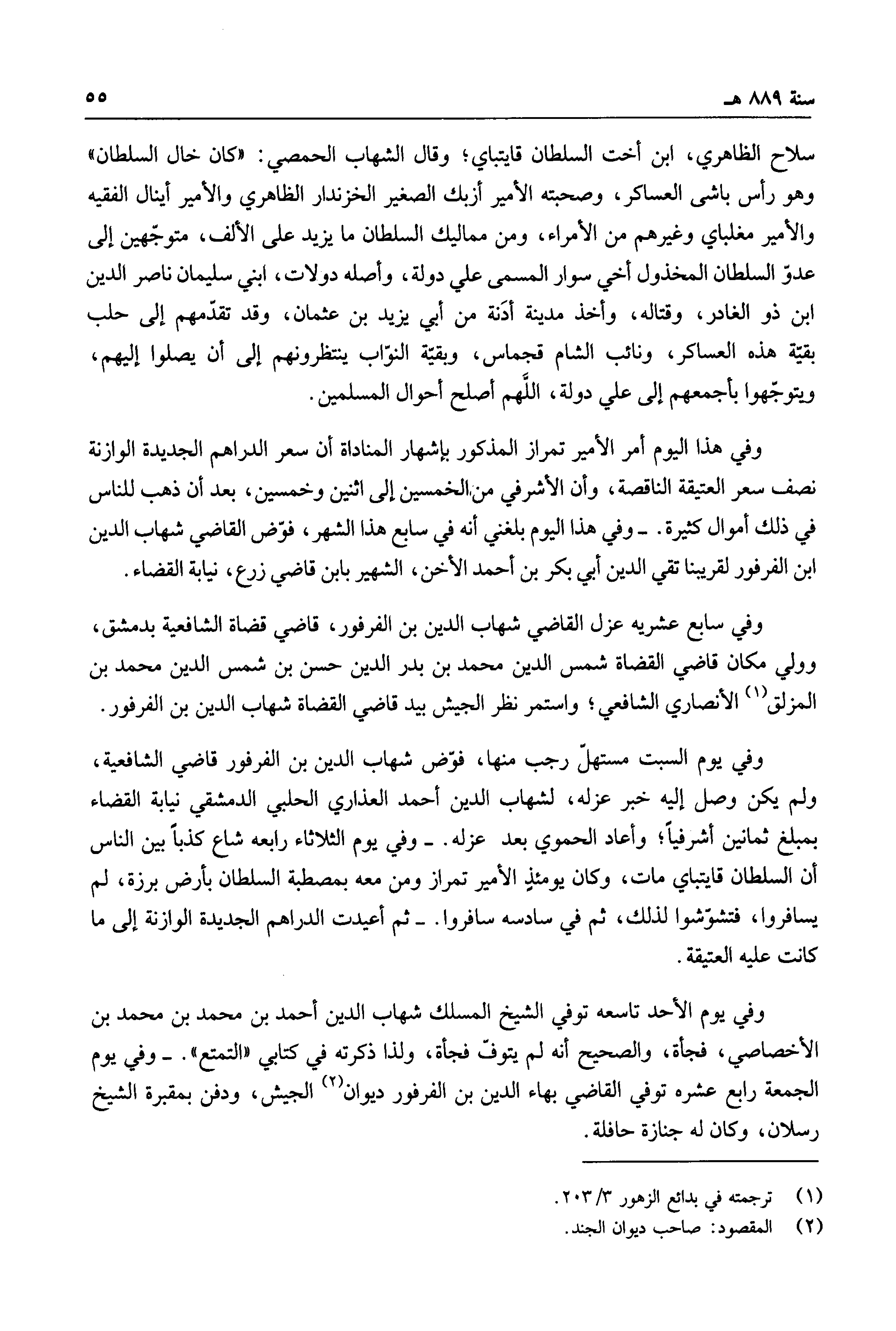 وفي يوم السبت مستهل رجب منها، فوض شهاب الدين بن الفرفور قاضي الشافعية، ولم يكن وصل إليه خبر عزله، لشهاب الدين أحمد العذاري الحلبي الدمشقي نيابة القضاء بمبلغ ثمانين أشرفياً؛ وأعاد الحموي بعد عزله. - وفي يوم الثلاثاء رابعه شاع كذباً بين الناس أن السلطان قايتباي مات، وكان يومئذٍ الأمير تمراز ومن معه بمصطبة السلطان بأرض برزة، لم يسافروا، فتشوشوا لذلك، ثم في سادسه سافروا. - ثم أعيدت الدارهم الجديدة الوازنة إلى ما كانت عليه العتيقة.
