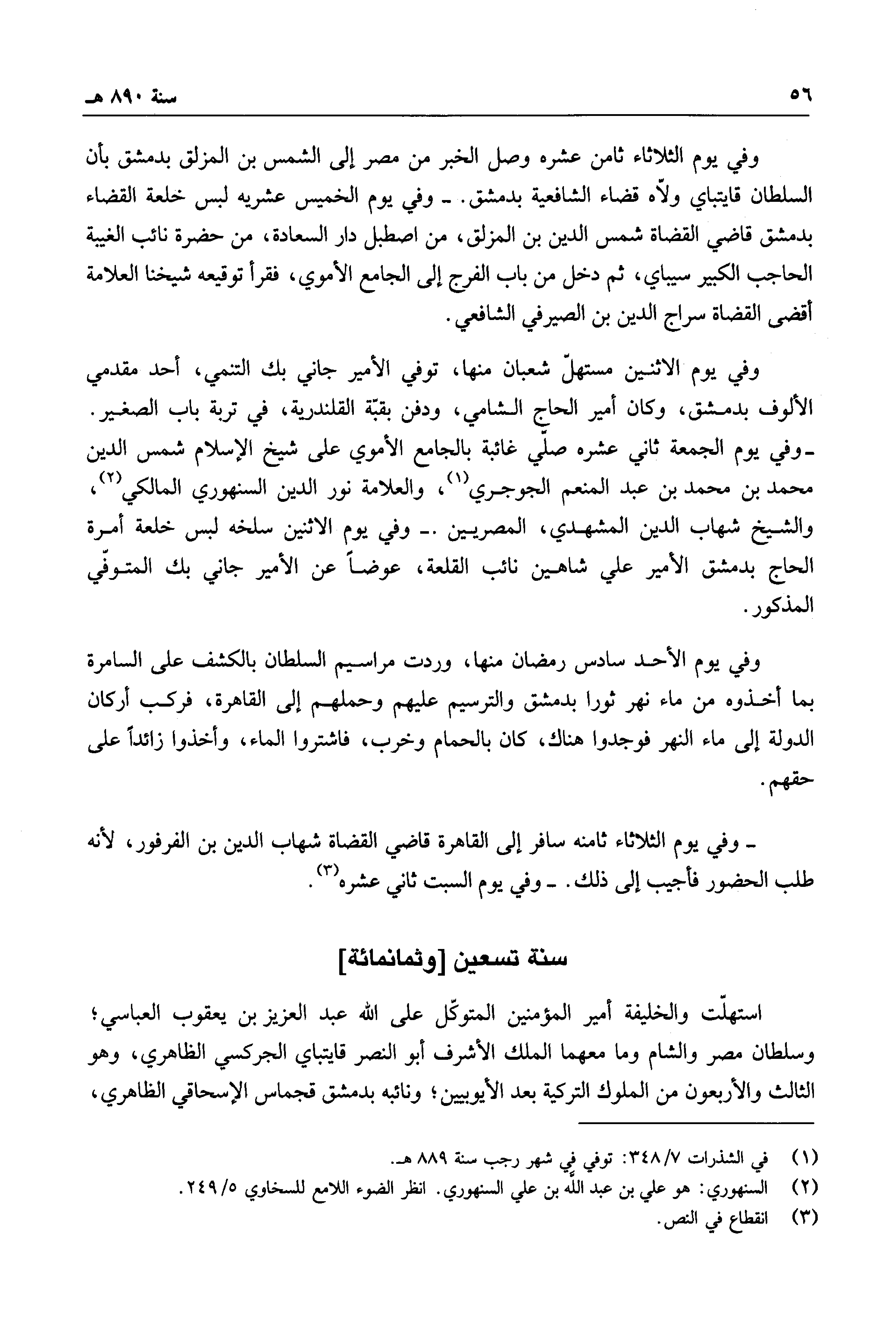 وفي يوم الاثنين مستهلّ شعبان منها، توفي الأمير جاني بك التنمي، أحد مقدمي الألوف بدمشق، وكان أمير الحاج الشامي، ودفن بقبة القلندرية، وفي تربة باب الصغير. وفي يوم الجمعة ثاني عشره صلي غائبة بالجامع الأموي على شيخ الإسلام شمس الدين محمد بن محمد بن عبد المنعم الجوجري، والعلامة نور الدين السنهوري المالكي، والشيخ شهاب الدين المشهدي، المصريين. - وفي يوم الاثنين سلخه لبس خلعة أمرة الحاج بدمشق الأمير علي شاهين نائب القلعة، عوضاً عن الأمير جاني بك المتوفي المذكور.