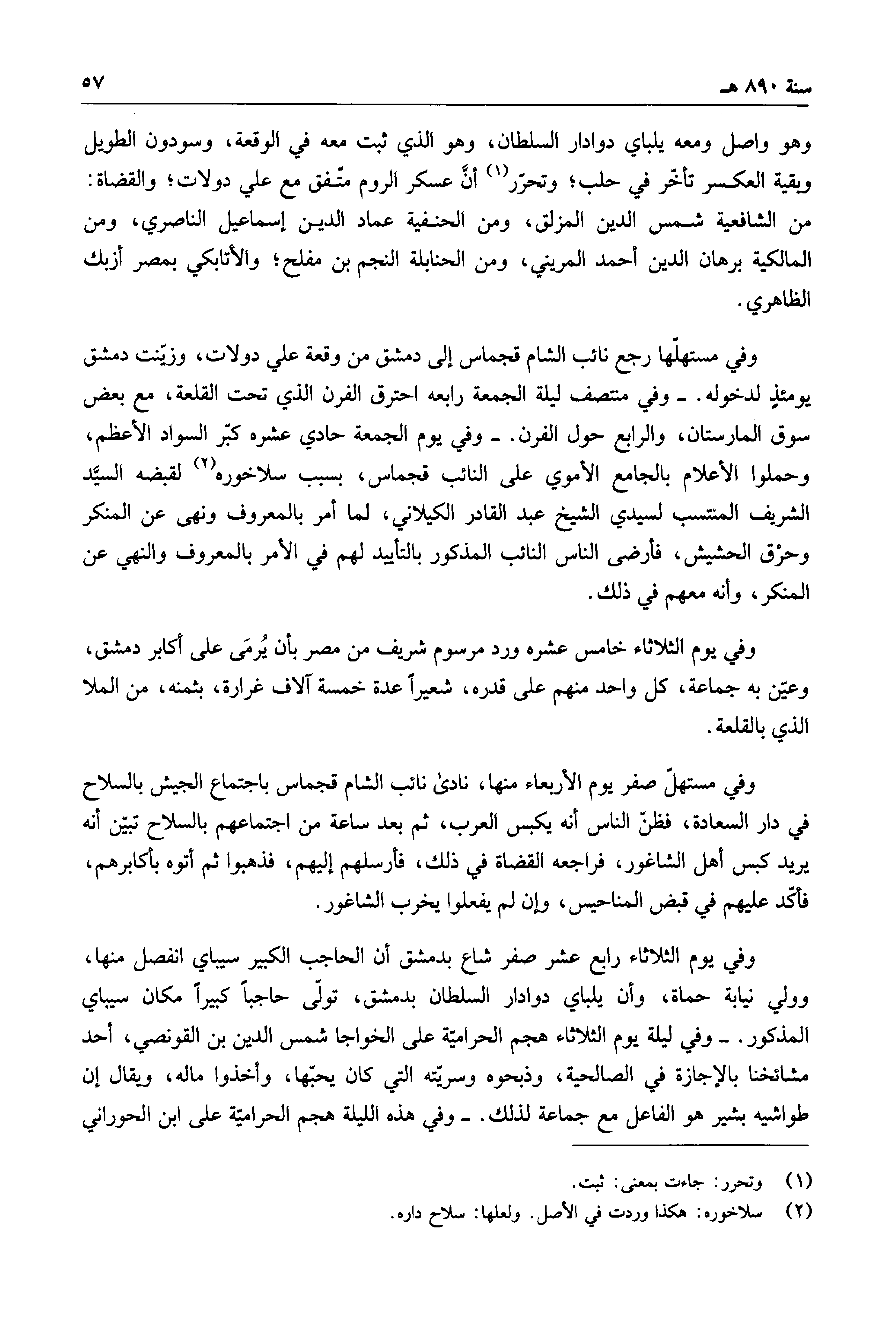 وهو واصل ومعه يلباي دوادار السلطان، وهو الذي ثبت معه في الوقعة، وسودون والطويل وبقية العكسر تأخر في حلب، وتحرر أن عسكر الروم متفق مع علي دولات، والقضاة: من الشافعية شمس الدين المزلق، ومن الحنفية عماد الدين إسماعيل الناصري، ومن المالكية برهان الدين أحمد المريني، ومن الحنابلة النجم بن مفلح، والأتابكي بمصر أزبك الظاهري.