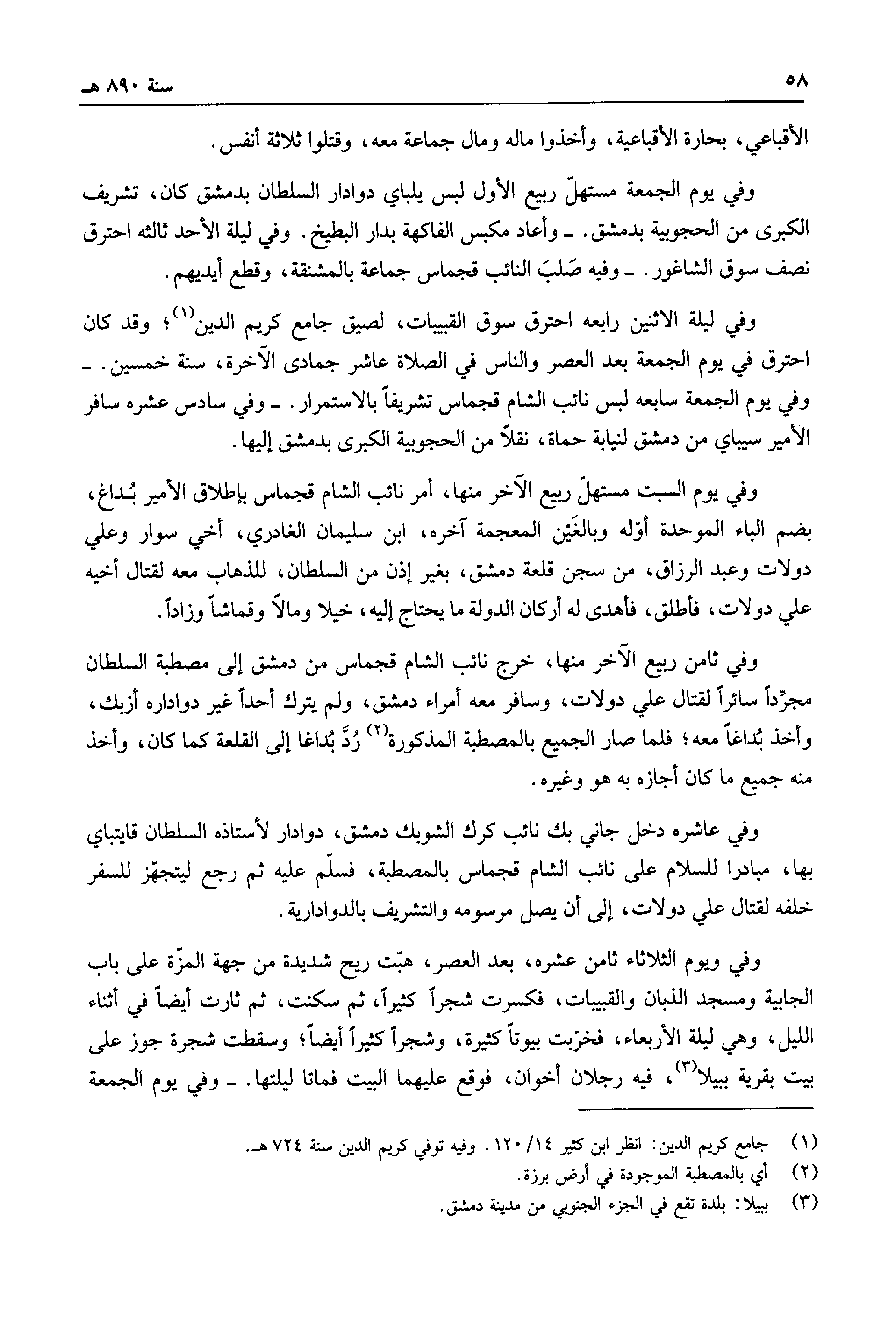 وفي ليلة الاثنين رابعه احترق سوق القبيبات، لصيق جامع كريم الدين، وقد كان احترق في يوم الجمعة بعد العصر والناس في الصلاة عاشر جمادى الآخرة، سنة خمسين. وفي يوم الجمعة سابعه لبس نائب الشام قجماس تشريفاً بالاستمرار. وفي سداس عشره سافر الأمير سيباي من دمشق لنيابة حماة، نقلاً من الحجوبية الكبرى بدمشق إليها.
