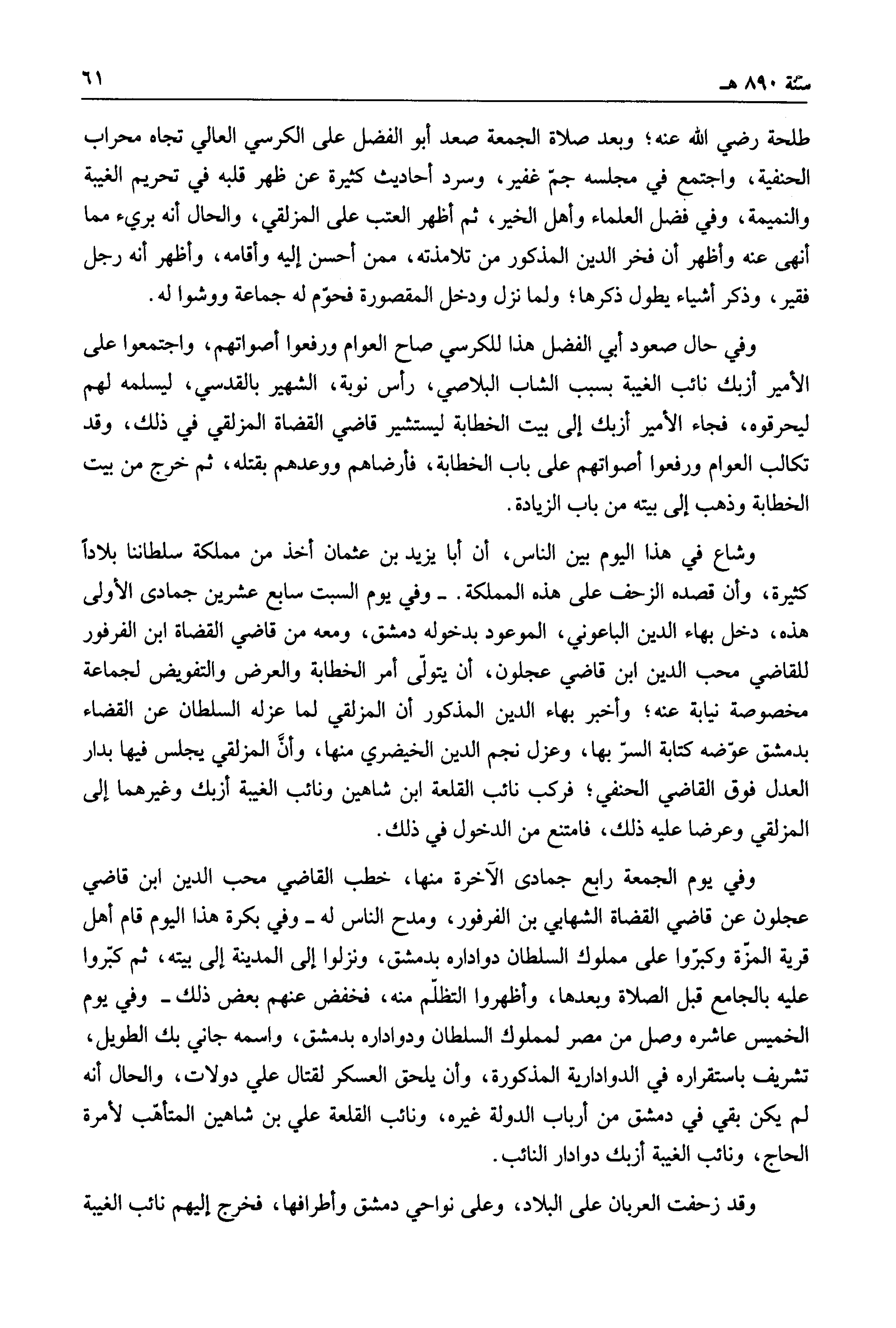 وفي يوم الجمعة رابع جمادى الآخرة منها، خطب القاضي محب الدين ابن قاضي عجلون عن قاضي القضاة الشهابي بن الفرفور، ومدح الناس له - وفي بكرة هذا اليوم قام أهل قرية المزة وكبروا على مملوك السلطان دواداره بدمشق، ونزلوا إلى المدينة إلى بيته، ثم كبروا عليه بالجامع قبل الصلاة وبعدها، وأظهروا التظلم منه، فخفض عنهم بعض ذلك - وفي يوم الخميس عاشره وصل من مصر لمملوك السلطان ودواداره بدمشق، واسمه جاني بك الطويل، تشريف باستقراره في الدوادارية المذكورة، وأن يلحق العسكر لقتال علي دولات، والحال أنه لم يكن بقي في دمشق من أرباب الدولة غيره، ونائب القلعة علي بن شاهين المتأهب لأمرة الحاج، ونائب الغيبة أزبك دوادار النائب.