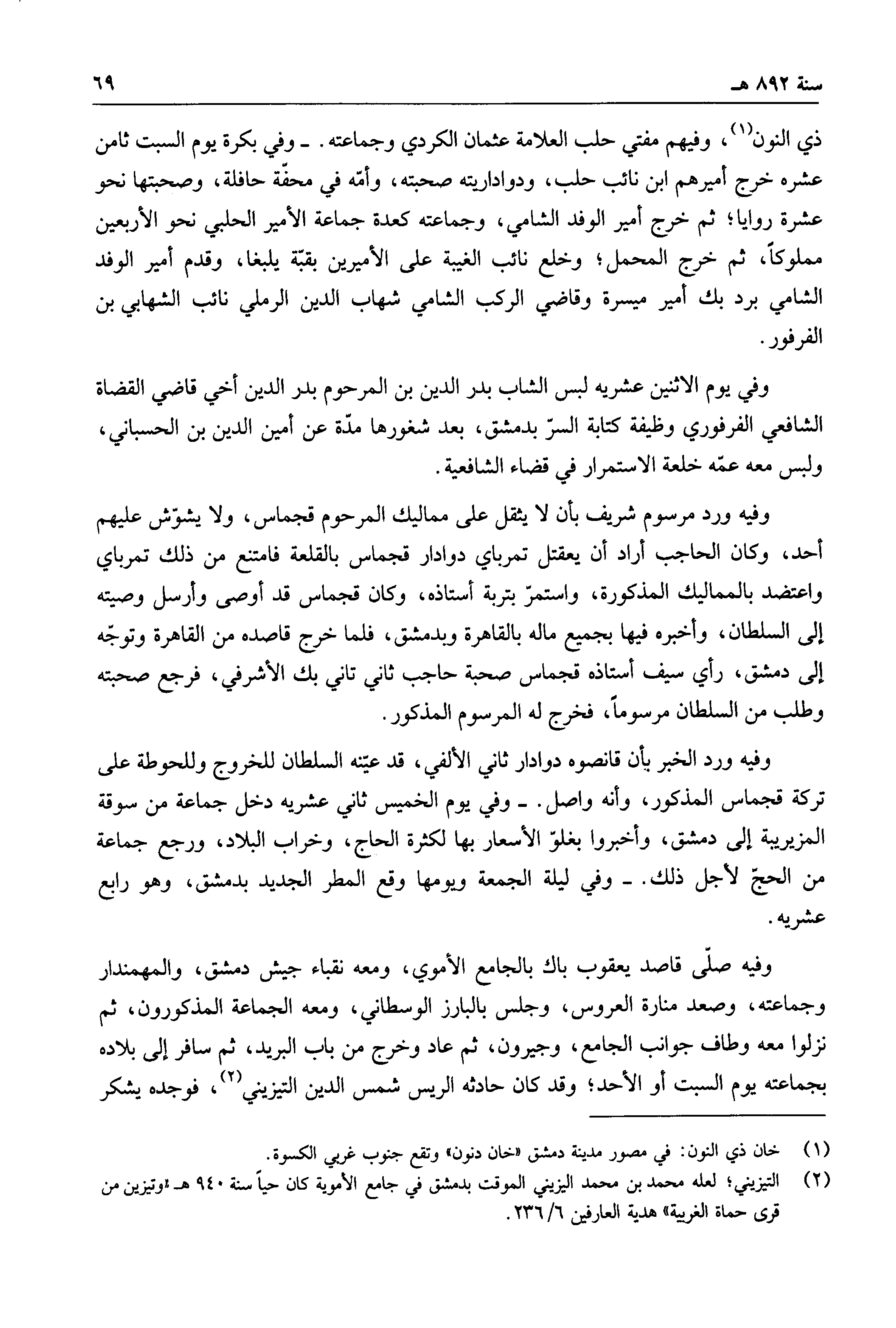 ذي النون، وفيهم مفتي حلب العلامة عثمان الكردي وجماعته. وفي بكرة يوم السبت ثامن عشره خرج أميرهم ابن نائب حلب، ودواداريته صحبته، وأمه في محفة حافلة، وصحبتها نحو عشرة روايا، ثم خرج أمير الوفد الشامي، وجماعته كعدة جماعة الأمير الحلبي نحو الأربعين مملوكاً، ثم خرج المحمل، وخلع نائب الغيبة على الأميرين بقية يلبغا، وقدم أمير الوفد الشامي برد بك أمير ميسرة وقاضي الركب الشامي شهاب الدين الرملي نائب الشهابي بن الفرفور.