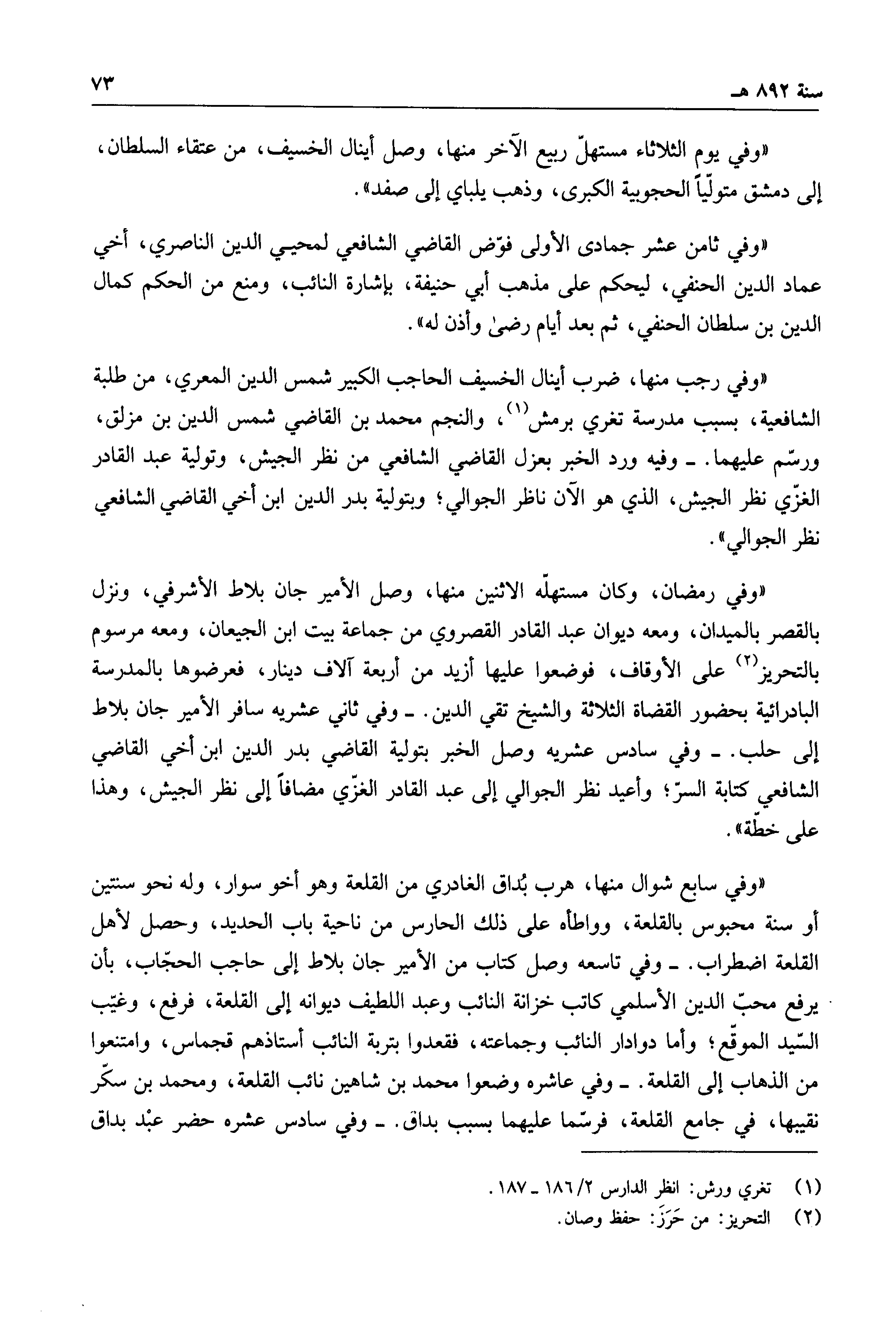 وفي عاشره وضعوا محمد بن شاهين نائب القلعة، ومحمد بن سكر نقيبها، في جامع القلعة، فرسما عليهما بسبب بداق. - وفي سادس عشره حضر عبد بداق