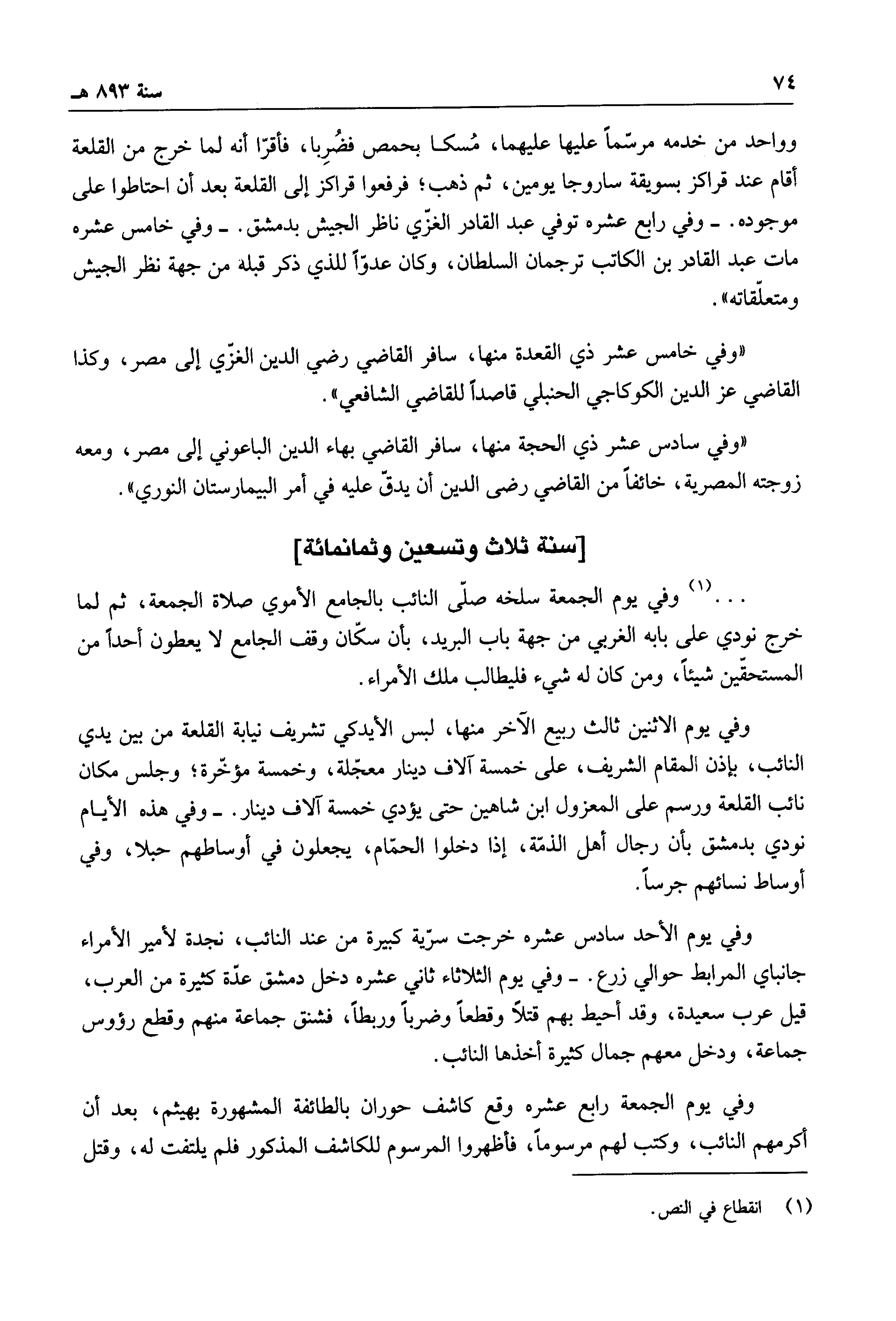 وفي يوم الأحد سادس عشره خرجت سرية كبيرة من عند النائب، نجدة لأمير الأمراء جانباي المرابط حوالي زرع. - وفي يوم الثلاثاء ثاني عشره دخل دمشق عدة كثيرة من العرب، قيل عرب سعيدة، وقد أحيط بهم قتلاً وقطعاً وضرباً وربطاً، فشنق جماعة منهم وقطع رؤوس جماعة، ودخل معهم جمال كثيرة أخذها النائب.