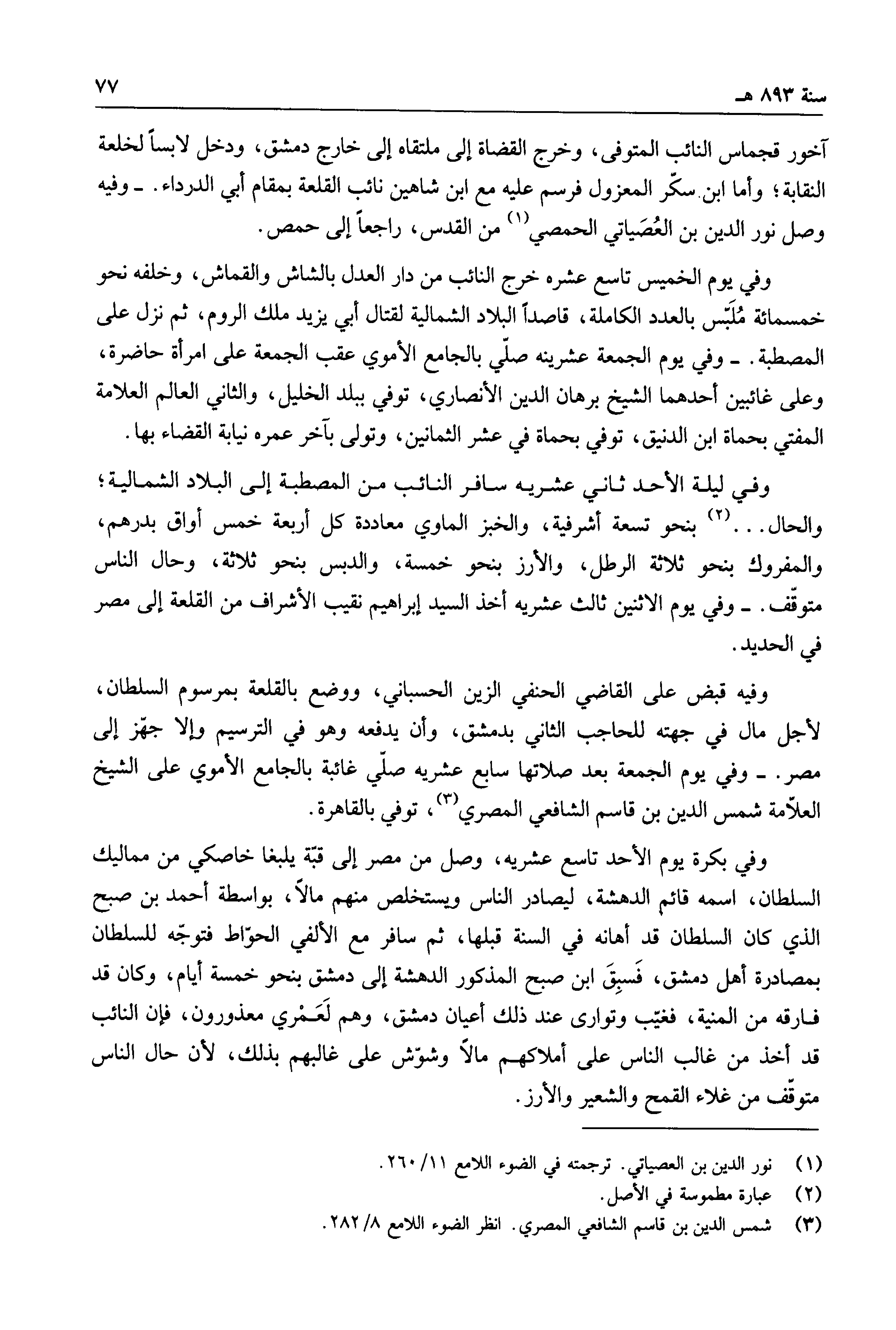 آخور قجماس النائب المتوفى، وخرج القضاة إلى ملتقاه إلى خارج دمشق، ودخل لابساً لخلعة النقابة؛ وأما ابن سكر المعزول فرسم عليه مع ابن شاهين نائب القلعة بمقام أبي الدرداء.