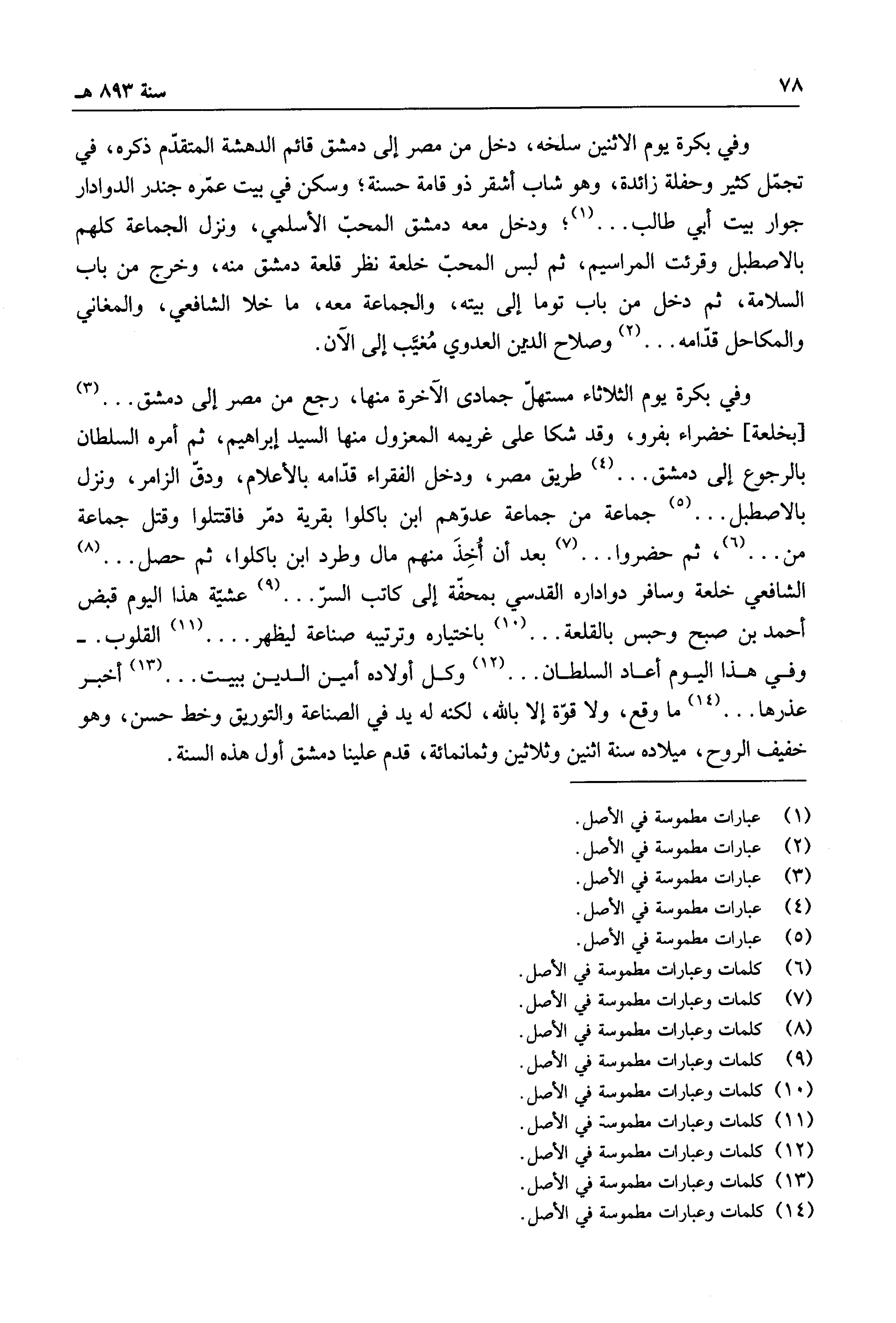 وفي بكرة يوم الثلاثاء مستهل جمادى الآخرة منها، رجع من مصر إلى دمشق ... بخلعة خضراء بفرو، وقد شكا على غريمه المعزول منها السيد إبراهيم، ثم أمره السلطان بالرجوع إلى دمشق.... طريق مصر، ودخل الفقراء قدامه بالأعلام، ودق الزامر، ونزل بالإصطبل ... جماعة من جماعة عدوهم ابن باكلوا بقرية دمر فاقتتلوا وقتل جماعة من ... ، ثم حضروا.... بعد أن أخذ منهم مال، وطرد ابن باكلوا، ثم حصل ... الشافعي خلعة وسافر دواداره القدسي بمحفة إلى كاتب السر ... عشية هذا اليوم قبض أحمد بن صبح وحبس بالقلعة ... باختياره وترتيبه صناعة ليظهر ... القلوب..... وفي هذا اليوم أعاد السلطان ... وكل أولاده أمين الدين ببيت ... أخبر عذرها ... ما وقع، ولا قوة إلا بالله، لكنه له يد في الصناعة والتوريق وخط حسن، وهو خفيف الروح، ميلاده سنة اثنين وثلاثين وثمانمائة، قدم علينا دمشق أول هذه السنة.