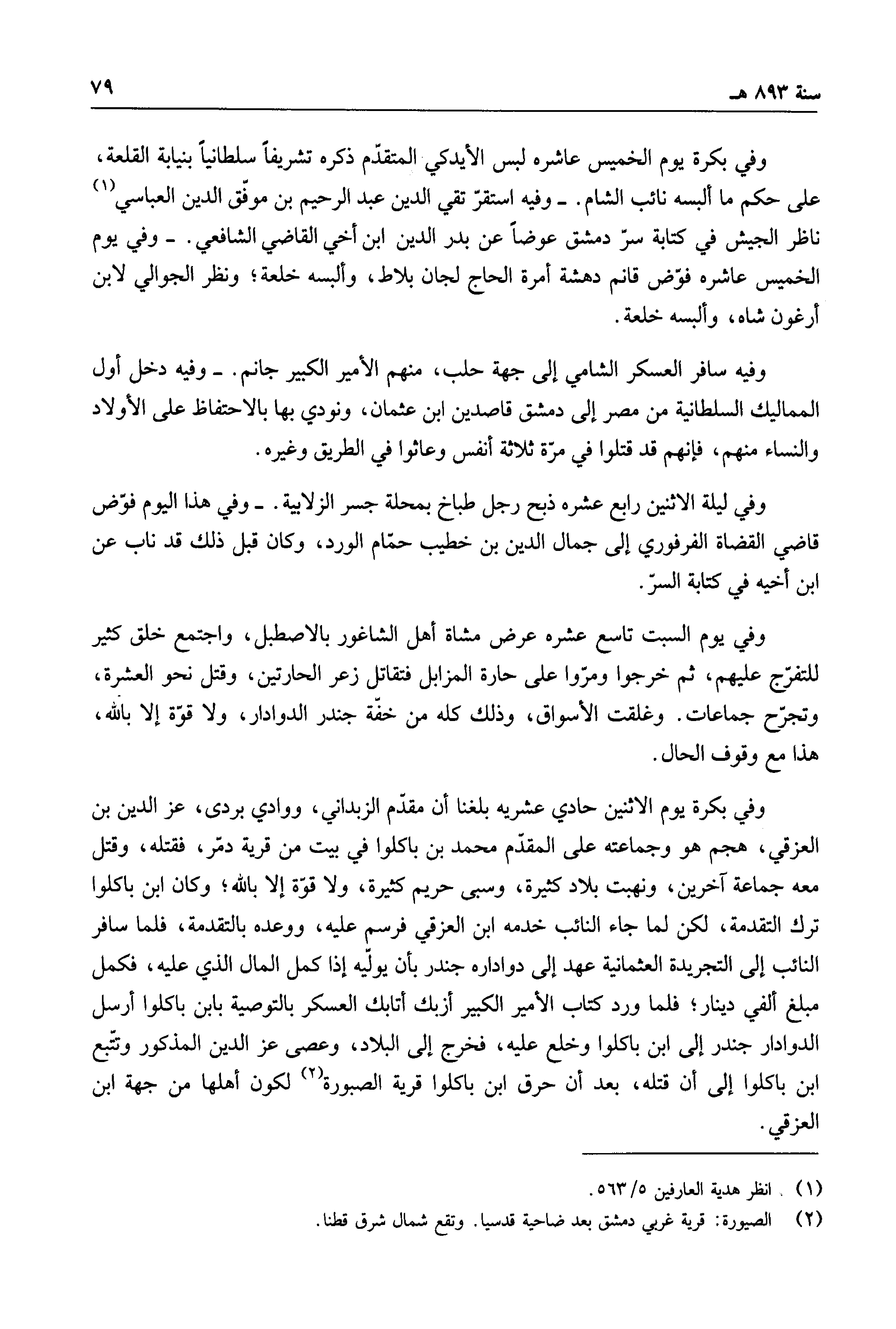 وفي بكرة يوم الاثنين حادي عشريه بلغنا أن مقدم الزبداني، ووادي بردى، عز الدين بن العزقي، هجم هو وجماعته على المقدم محمد بن باكلوا في بيت من قرية دمر، فقتله، وقتل معه جماعة آخرين، ونهبت بلاد كثيرة، وسبي حريم كثيرة، ولا قوة إلا بالله، وكان ابن باكلوا ترك التقدمة، لكن لما جاء النائب خدمه ابن العزقي فرسم عليه، ووعده بالتقدمة، فلما سافر النائب إلى التجريدة العثمانية عهد إلى دواداره جندر بأن يوليه إذا كمل المال الذي عليه، فكمل مبلغ ألفي دينار، فلما ورد كتاب الأمير الكبير أزبك أتابك العسكر بالتوصية بابن باكلوا أرسل الدوادر جندر إلى ابن باكلوا وخلع عليه، فخرج إلى البلاد، وعصى عز الدين المذكور وتتبع ابن باكلوا إلى أن قتله، بعد أن حرق ابن باكلوا قرية الصبورة لكون أهلها من جهة ابن العزقي.